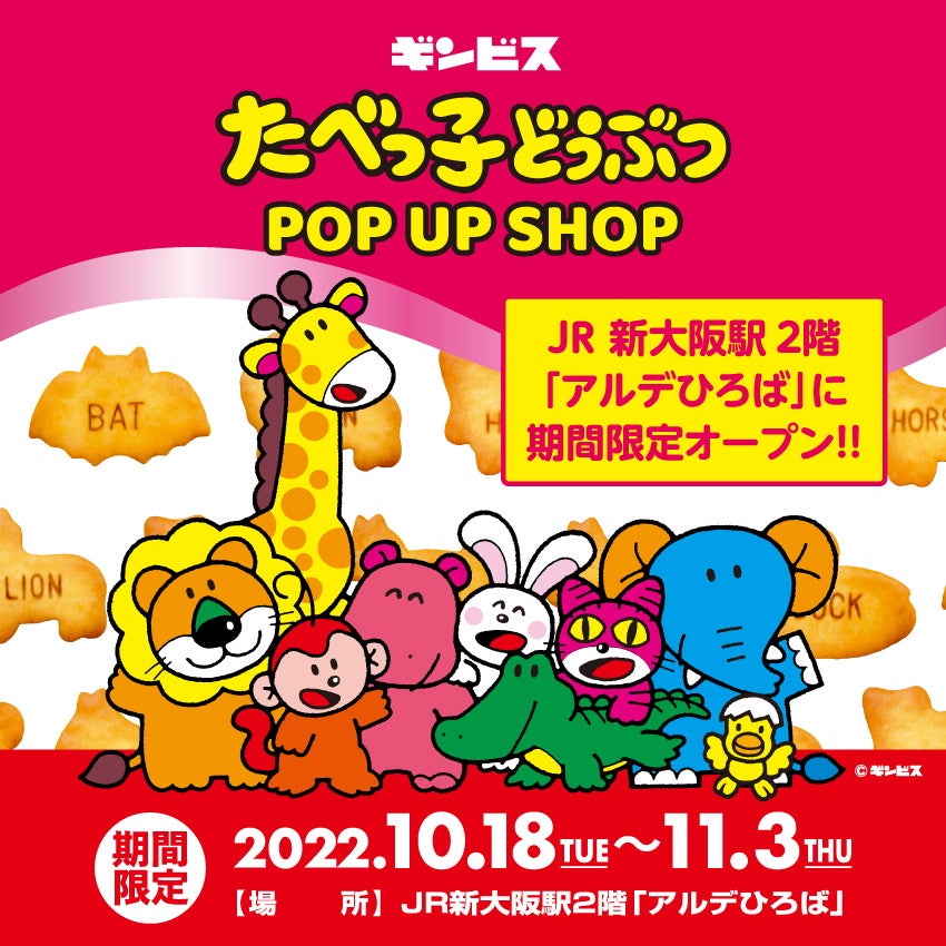 オリジナル商品の企画・制作・販売を軸に、企業・組織のトータルブランディングを手掛ける株式会社ヘソプロダクション(本社:大阪市福島区・代表取締役:稲本ミノル)は、2022年10月18日(火)から11月3日(木)までの間、JR新大阪駅2階「アルデひろば」にて、ギンビスの『たべっ子どうぶつ』をモチーフにしたグッズをたくさん集めた期間限定ショップ『たべっ子どうぶつ POP UP SHOP』を開催いたします。