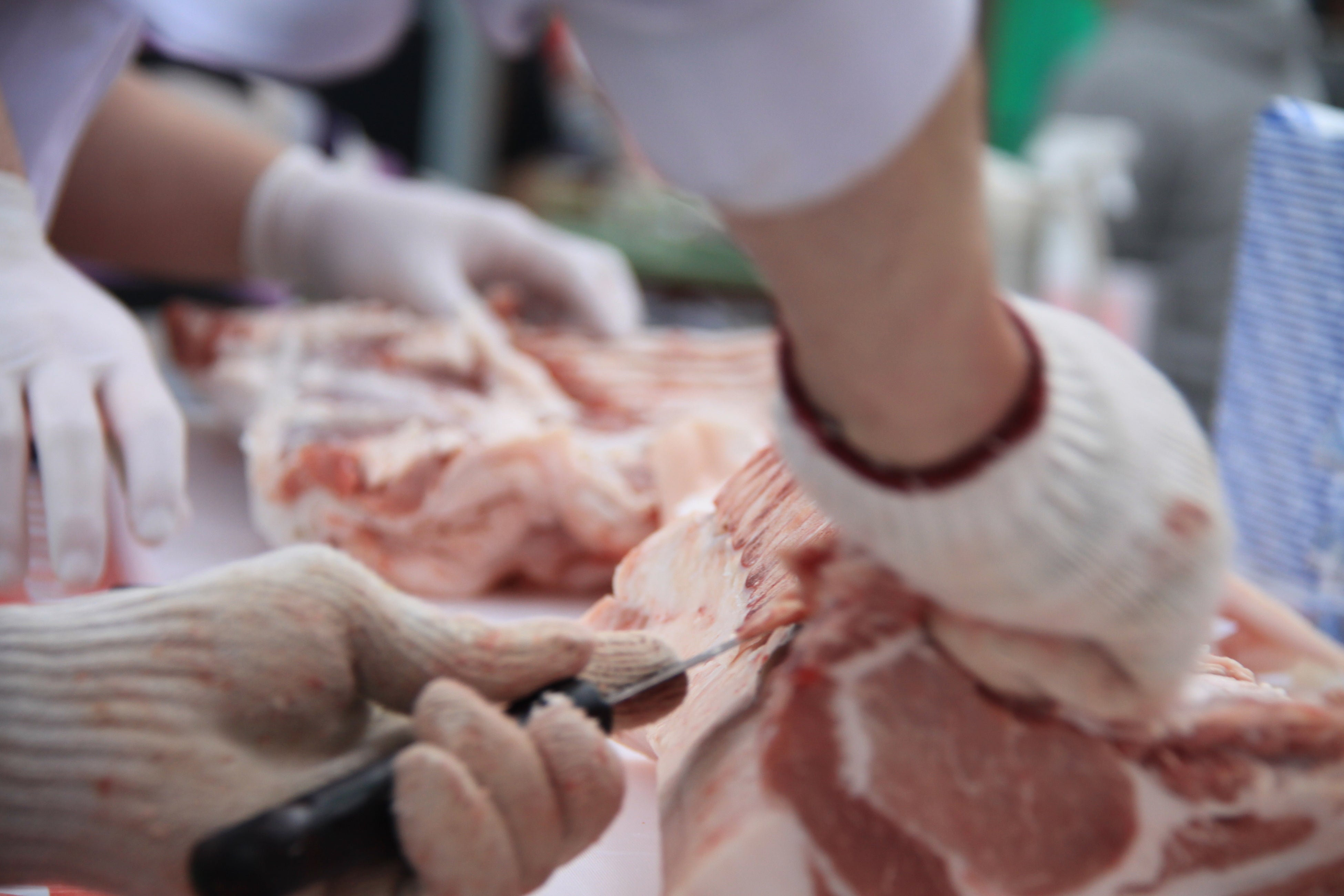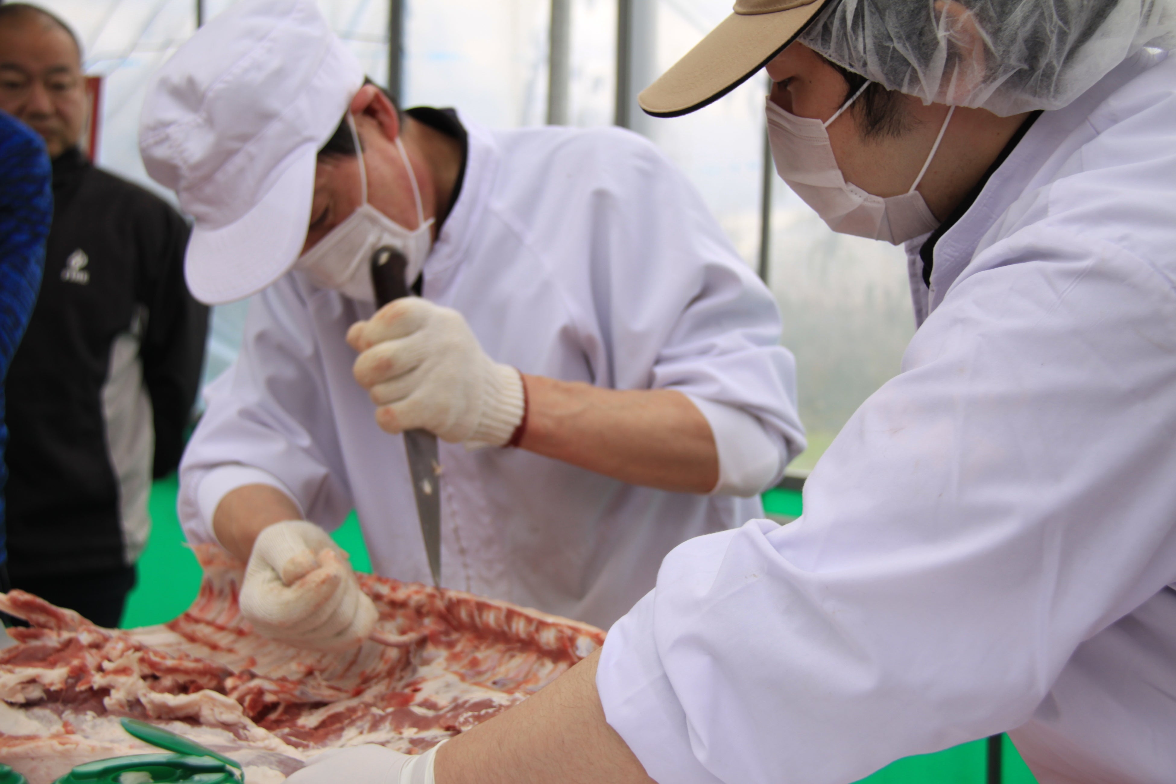 当日は岩野精肉店オリジナルポーク ”眠り豚はるな”の枝肉(骨や油のついた状態のお肉)を分かりやすい説明付きで職人さんが解体します。迫力満点の大きな枝肉が少しづつ皆さんが普段お肉屋さんやスーパーで見る”お肉”に変化していく様子は圧巻です。