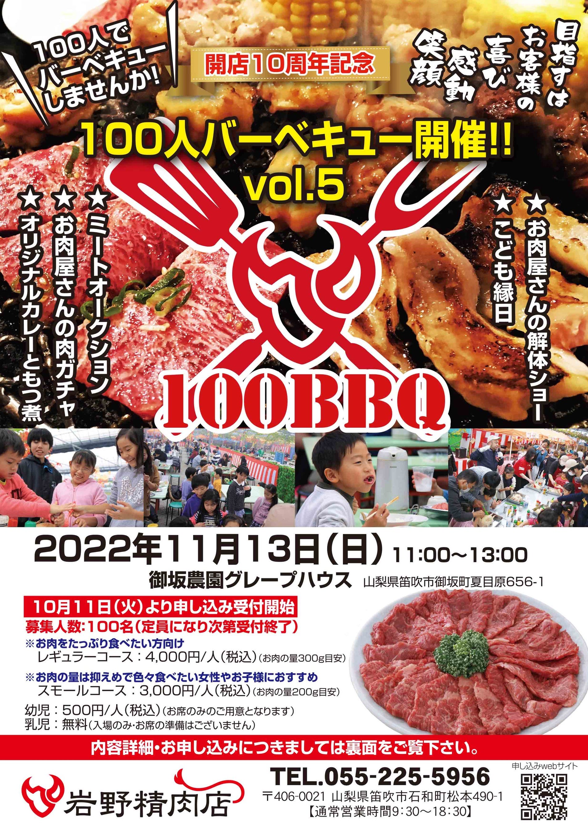 創業71年、山梨県笛吹市に店を構える”岩野精肉店”は、直営小売店舗開業10周年を記念して、2年ぶりに第5回100人バーベキューを2022年11月13日に山梨県笛吹市の御坂農園グレープハウスにて開催致します。
