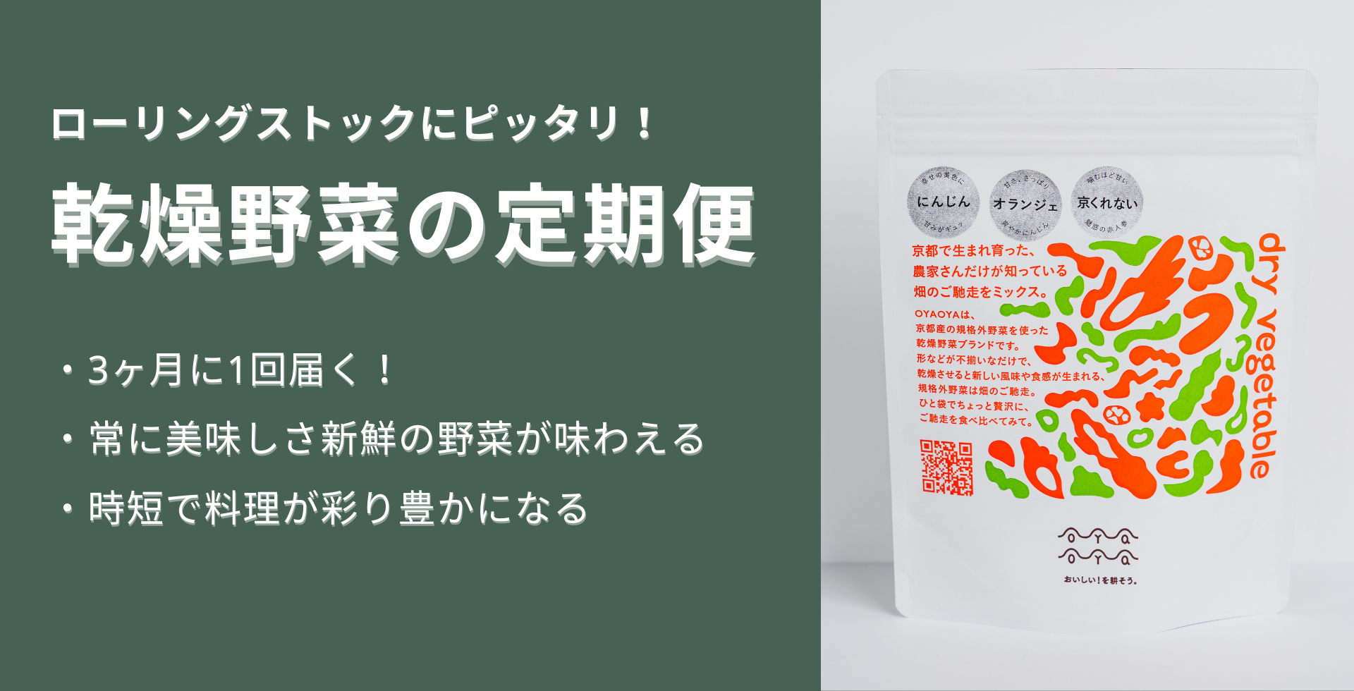 京都産の規格外野菜を使った乾燥野菜ブランド「OYAOYA」は、常温で半年間日持ち、ローリングストックにピッタリな乾燥野菜の定期便をご提案します。