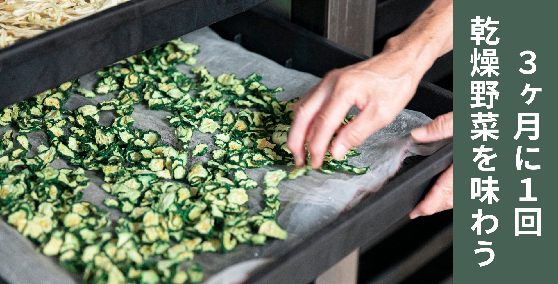 OYAOYAの乾燥野菜は製造から半年間ほど日持ちがします。しかし、ブドウ糖などの添加物などを使っていないため徐々に色が薄くなることがあります。そのため3ヶ月に1回のタイミングでお届けして常に美味しさ新鮮な乾燥野菜を食べてもらうため定期便が開始しました。