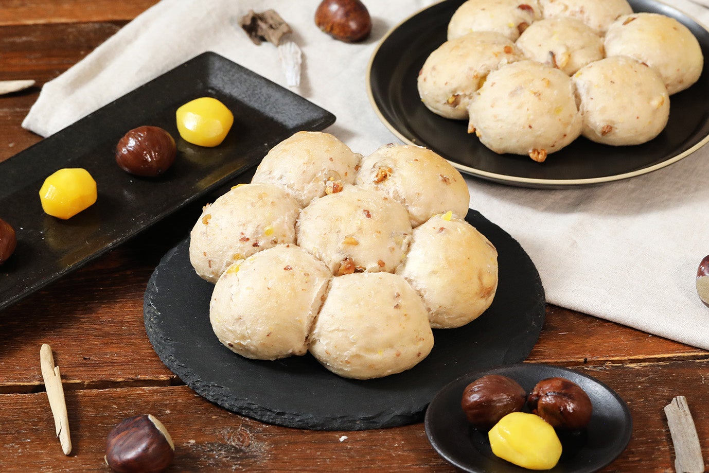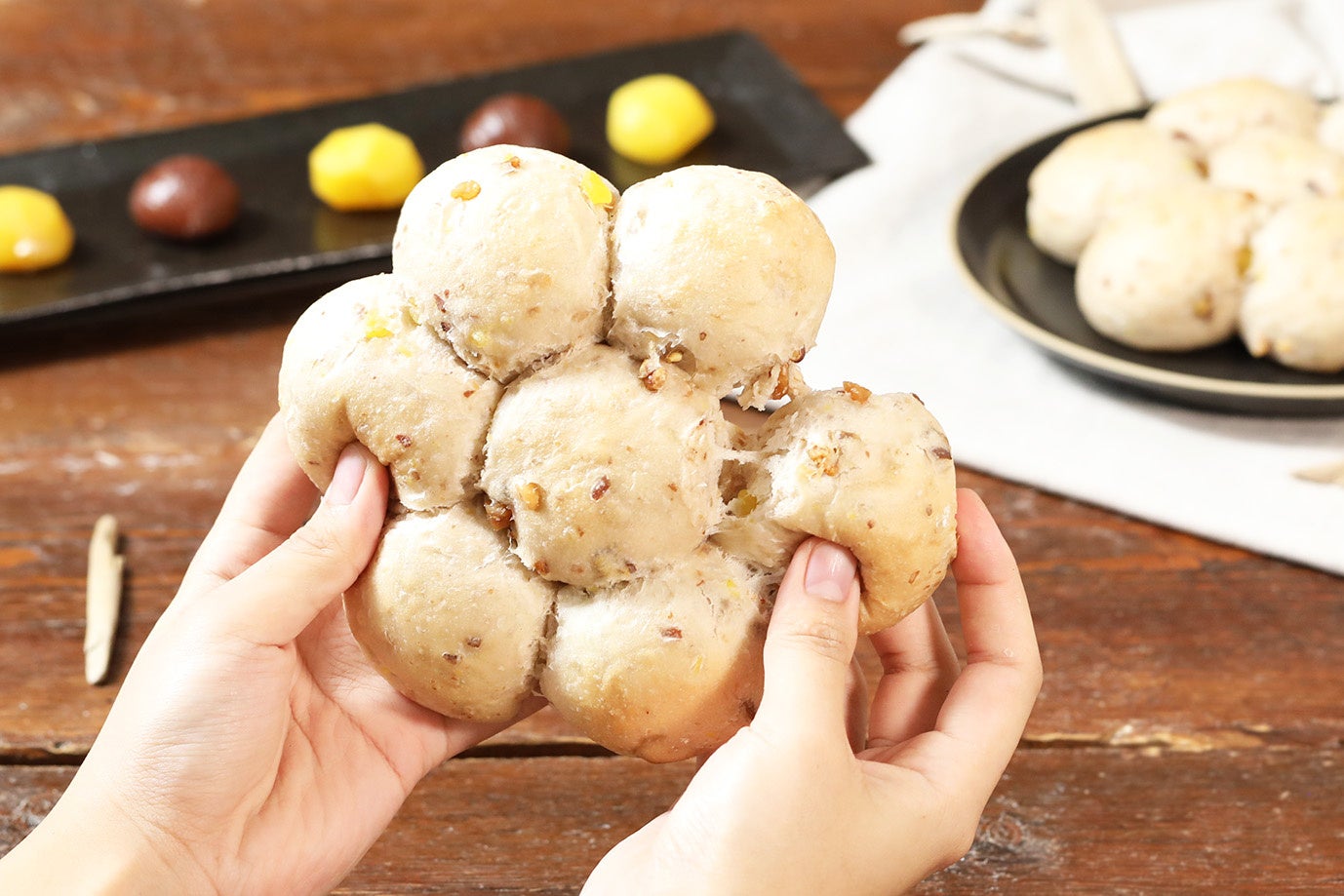 今年は黄栗と渋皮栗の2種の栗とくるみを練り込み、噛めば噛むほど栗の奥深い味わいをお楽しみいただけるちぎりパンに仕上げました。ちぎりパン特有のもっちり食感と口の中いっぱいに栗の旨味が広がり、「二乗」のネーミングにもふさわしい味わいに。