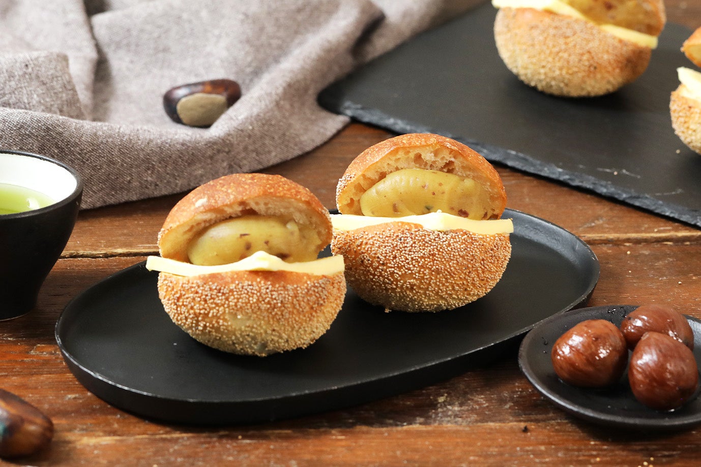 今年は黄栗と渋皮栗の2種の栗とくるみを練り込み、噛めば噛むほど栗の奥深い味わいをお楽しみいただけるちぎりパンに仕上げました。ちぎりパン特有のもっちり食感と口の中いっぱいに栗の旨味が広がり、「二乗」のネーミングにもふさわしい味わいに。