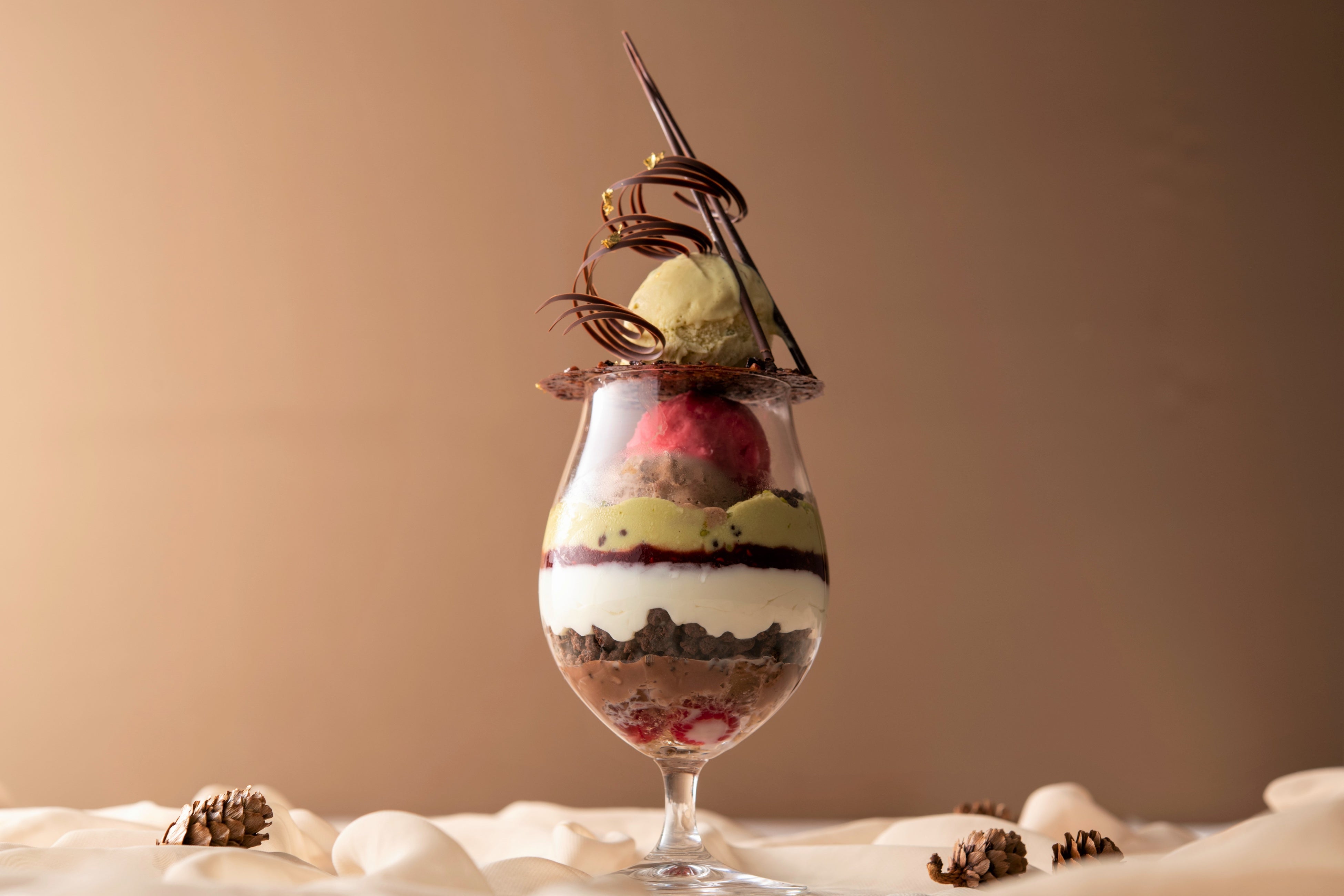 アイスクリームやガナッシュ、クランブル、板チョコなど、フレーバーや食感が異なるチョコレートを幾重にも重ねた、ショコラティエのこだわりが詰まった極上のチョコレートパフェ。相性の良いピスタチオのアイスやカスタードクリームをあわせ、爽やかな酸味のフランボワーズアイスやコンフィチュール、芳醇な香り漂うブランデーのジュレなどを忍ばせることで、様々に表情を変える大人の味わいに仕上げました。アーティスティックな盛り付けもさることながら、最後のひと匙までチョコレートの魅力を味わえる逸品です。