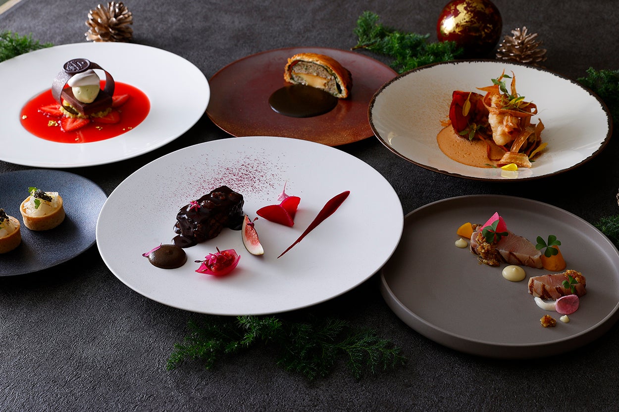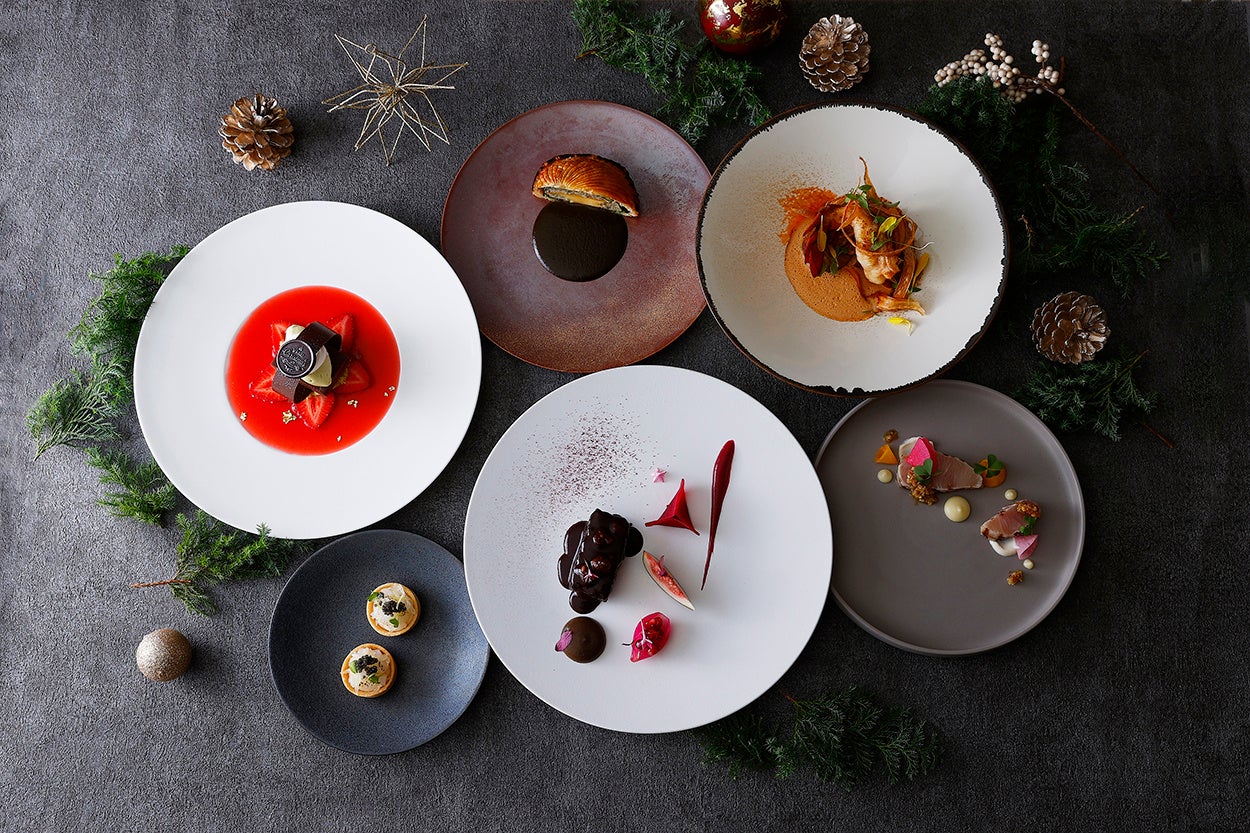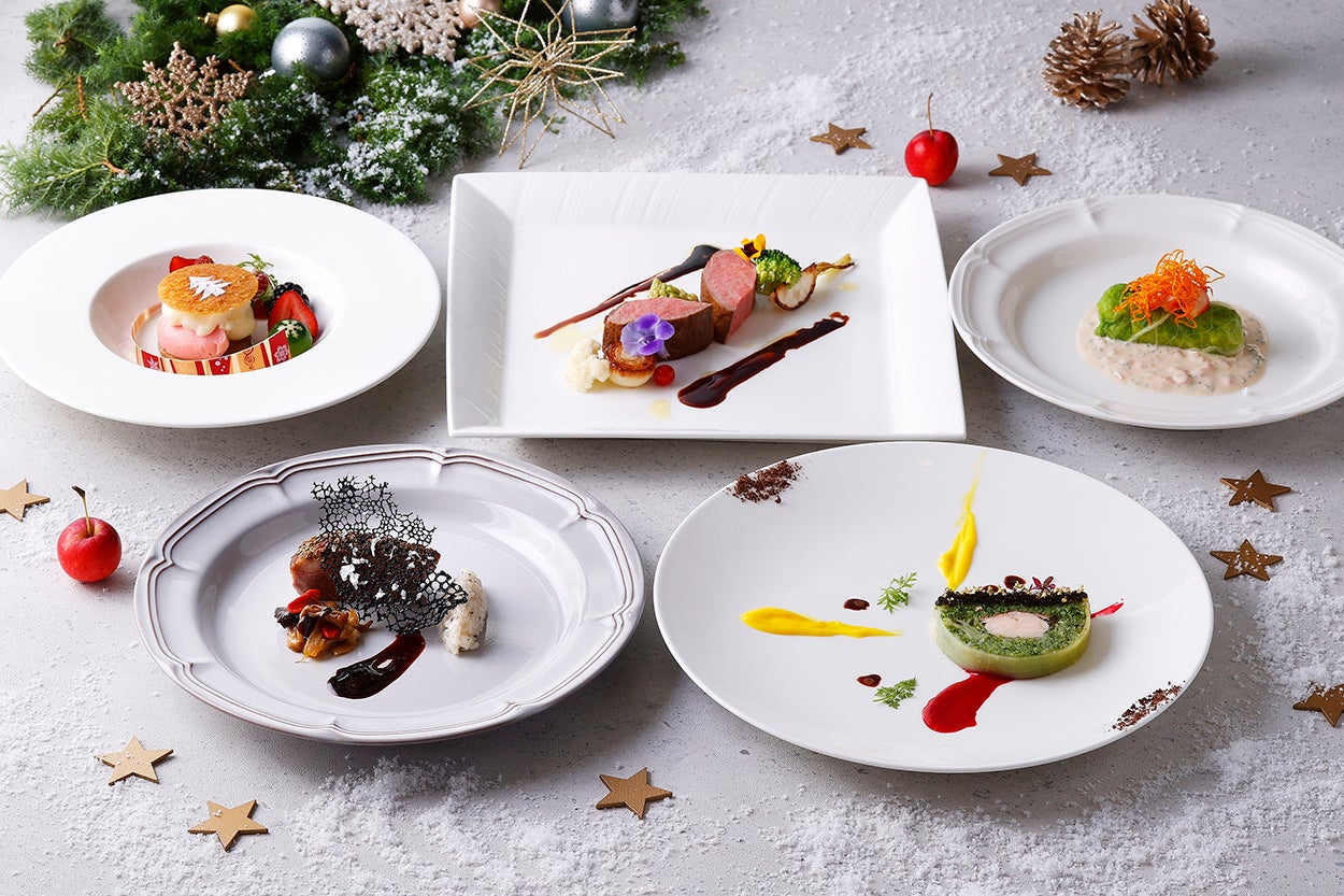 森をイメージし、野菜やきのこをふんだんに使用したメニューです。オマール海老やキャビア、金箔などの華やかな食材をはじめ、ビーツやサフランなど鮮やかな色合いのソースや冬野菜の彩りが、クリスマスムードを盛り上げます。