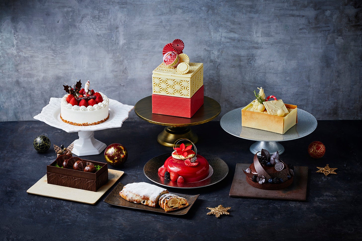 ホテル内にある伝統工芸品をモチーフにした造形など、シェフの職人技が光るアートなクリスマスケーキを7種ご用意いたします。芸術性溢れる見た目だけでなく、食材の組み合わせや、ミリ単位で配分を調整したケーキの層など、繊細な味わいをご堪能ください。