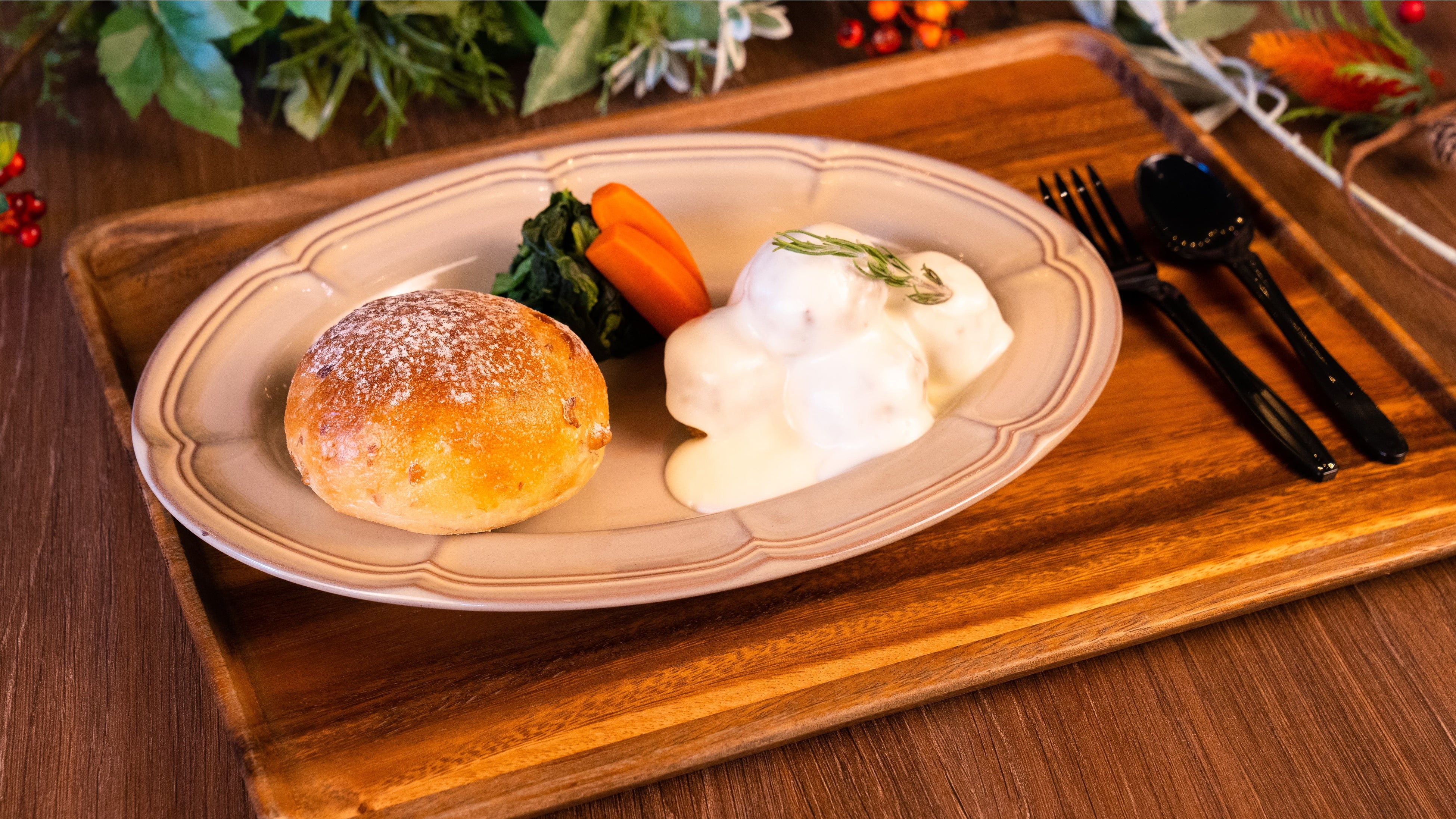 クリームソースをたっぷりとかけたミートボールでお腹満たされる一皿。
