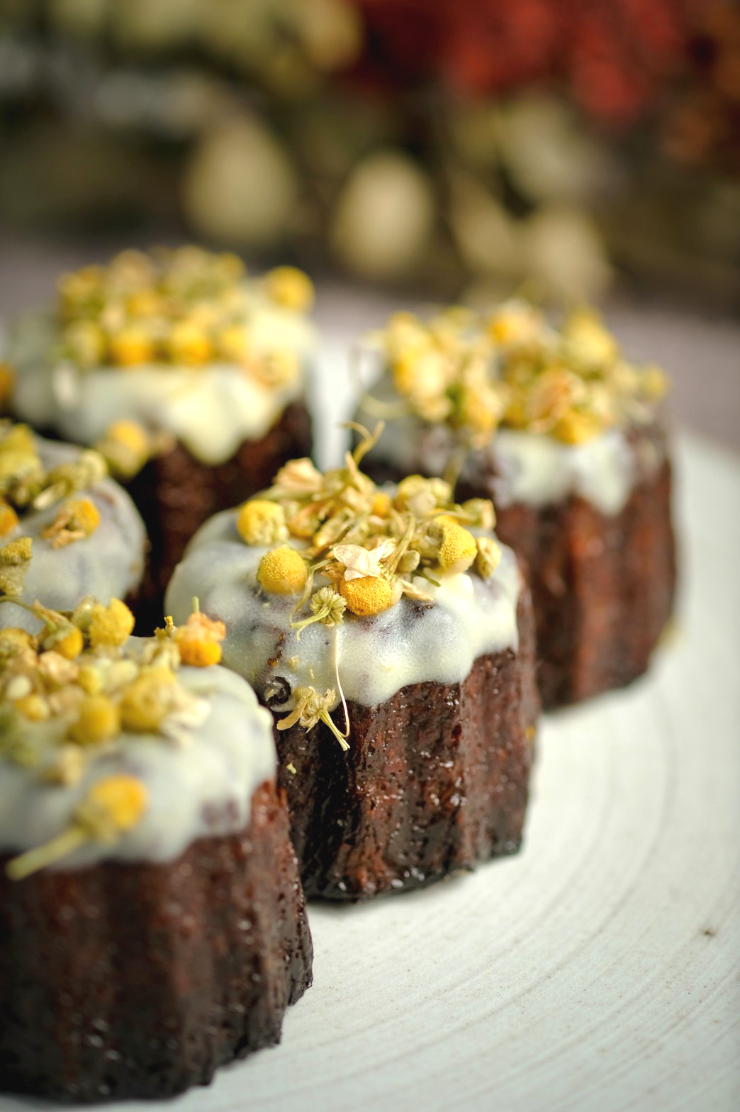 ジャスミンの茶葉を使用して焼き上げたカヌレに、エルダーフラワーのソース、カモミールをトッピング。
