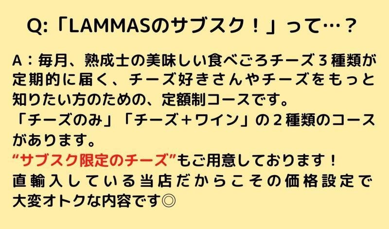LAMMASサブスクにさえ入っておけば、「今月もお疲れ様、自分!」という自分へご褒美のシーンで「チーズを買い忘れた。。。泣」と涙を飲むことや、持ち寄りパーティーで注目の的になること間違いなし!「明日チーズ届くから、うちでパーティーしない?」なんていうのも粋ですね!