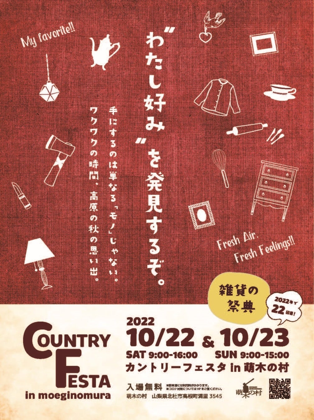 萌木の村株式会社(舩木上次社長、山梨県北杜市高根町清里3545)は、2022年10月22、23の両日、雑貨のイベント第22回「カントリーフェスタ」を開催いたします。キャッチコピーは「〝わたし好み〟を発見するぞ。」。紅葉が見ごろの清里高原で、心ときめく雑貨との出会いをお楽しみください。