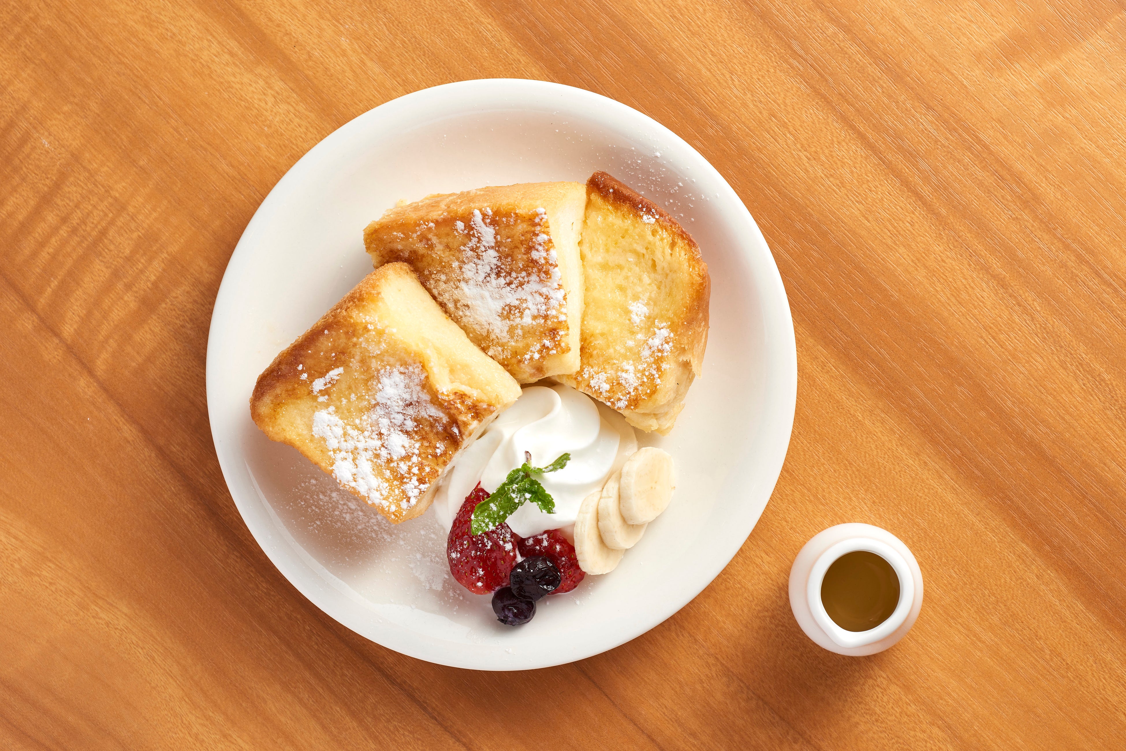 メディアにも頻繁に取り上げられ、リピーターが後を絶えない人気No.1の絶品メニュー「宣教師が愛したフレンチトースト」イギリスパンと内閣総理大臣賞を受賞している長野県産の卵を使用し、特製アパレイユにじっくりと浸した、しっとりとなめらかなその味わいをご賞味あれ。