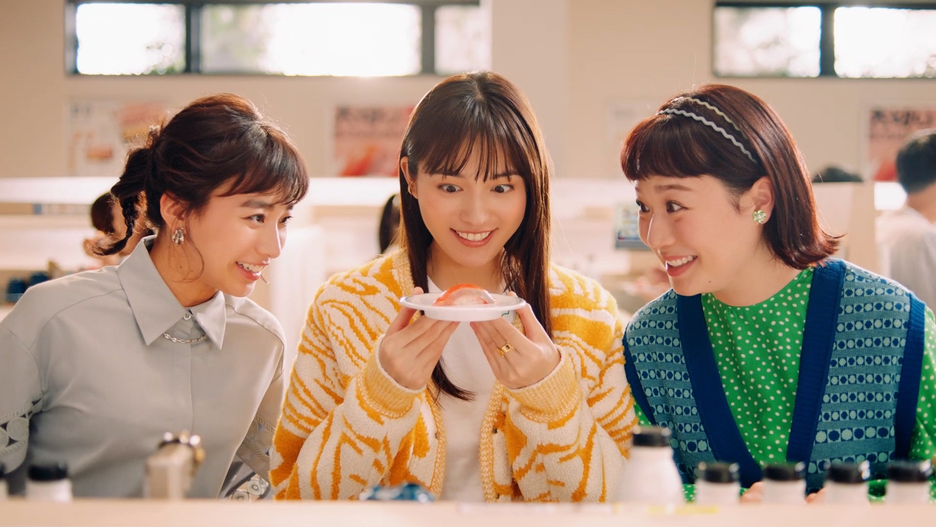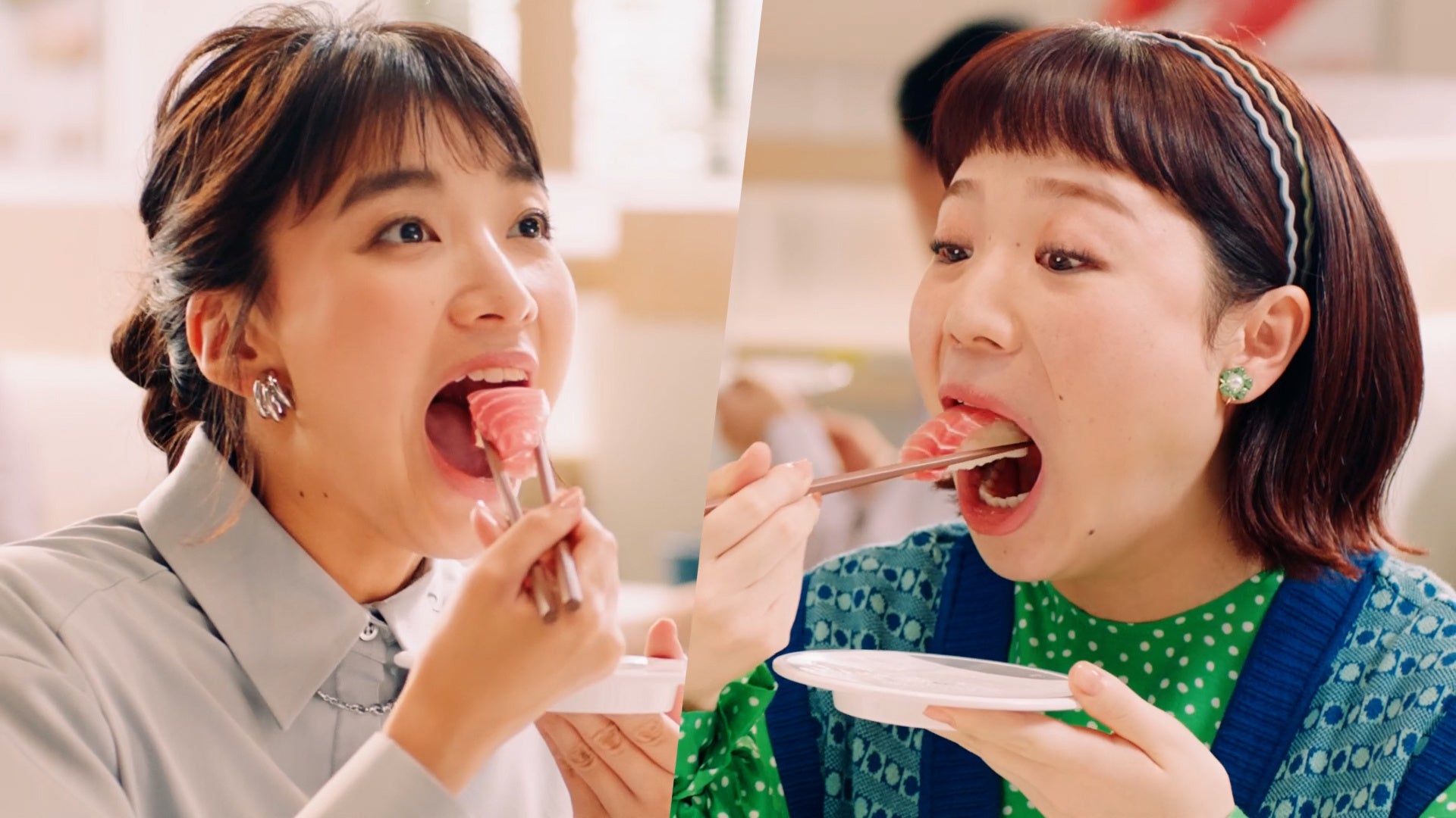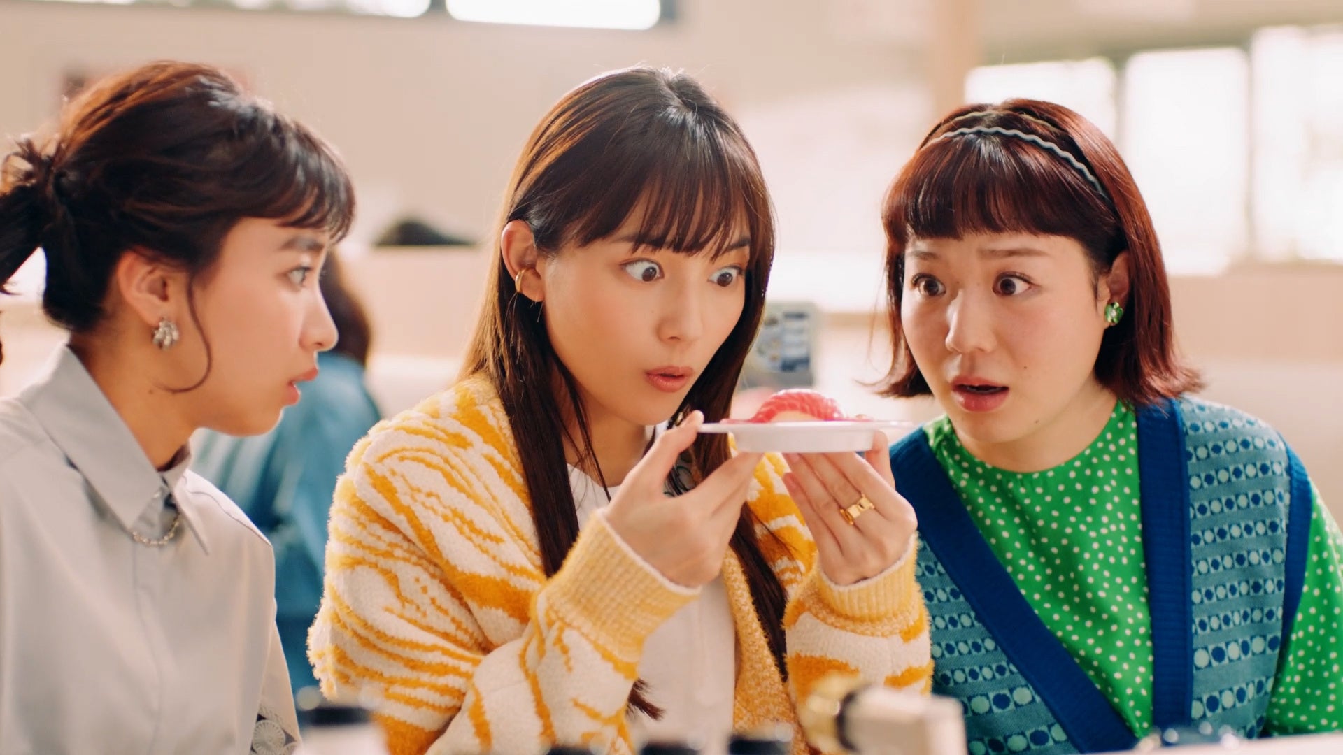 とにかくお寿司が大好きで、よく高校時代の友人とはま寿司で食事をする川口さん。「大切りまぐろはらみ」と「三陸産大切り銀鮭」の大きさに驚く3人。「ドデカくない・・・?」とネタの大きさに驚きつつ、ぱくりと一口で頬張ると、とろける味わいをかみしめ、お決まりのフレーズ「はまい!」と声を揃えます。
