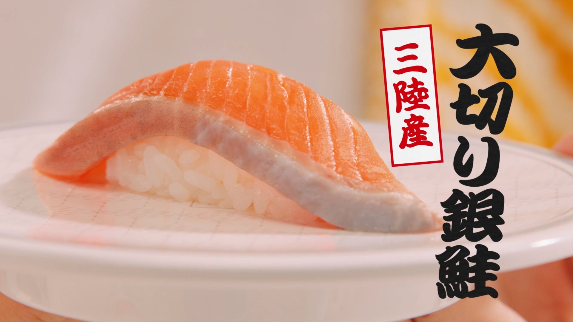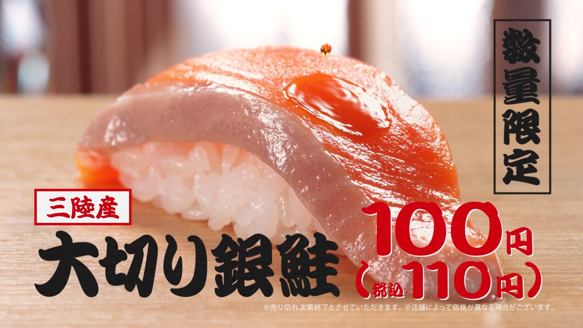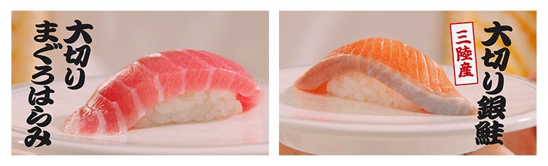 商品詳細:はま寿司が厳選したとろける味わいの「大切りまぐろはらみ」と「三陸産大切り銀鮭」を1皿100円