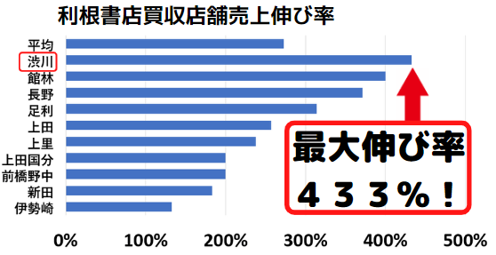 ときわ書店の事業継承前に運営していた「利根書店」24店舗のうち、10店舗が同業態の店舗を事業継承したもので、ときわ書店を含めた過去19店舗の継承額は約3億円にのぼります。売上の伸び率は継承前から平均すると273%と非常に好調です。最大の伸び率は433%と大きく伸びております。2022年中に3店舗、2023年に6店舗を順次「利根書店」にリニューアル予定で、5年後に9店舗で年商10億円を目標とします。