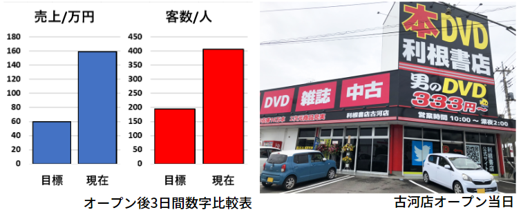 9月23日㈮のオープン後3日間の売上が、売上目標の265%、来客数目標の209%を達成いたしました。古河店から1ヶ月足らずでオープン予定の下館店では、古河店の目標売上の125%を目指します。