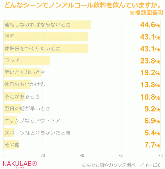 では、どんなシーンで飲むのかを複数回答可で聞いてみたところ、最も多かったのは「運転しなければならないとき」で45%、次いで同率2位が「晩酌」と「休肝日をつくりたいとき」で43%でした。