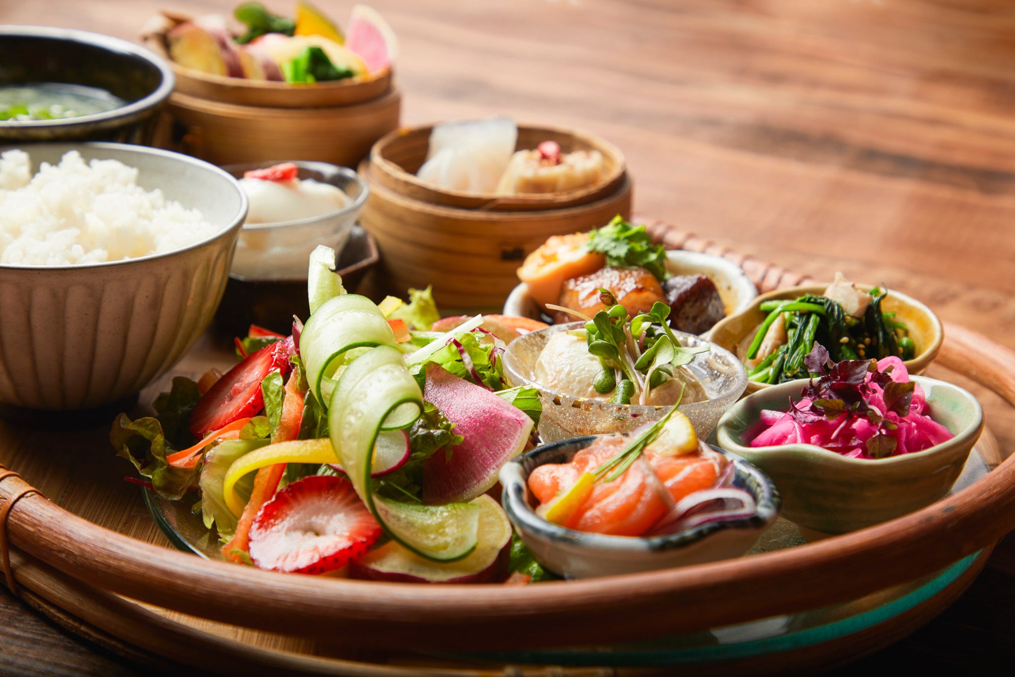 有機野菜にこだわった生野菜、食物繊維たっぷりの蒸籠蒸し温野菜など全25種の野菜が楽しめる健康的なメニューラインナップ。