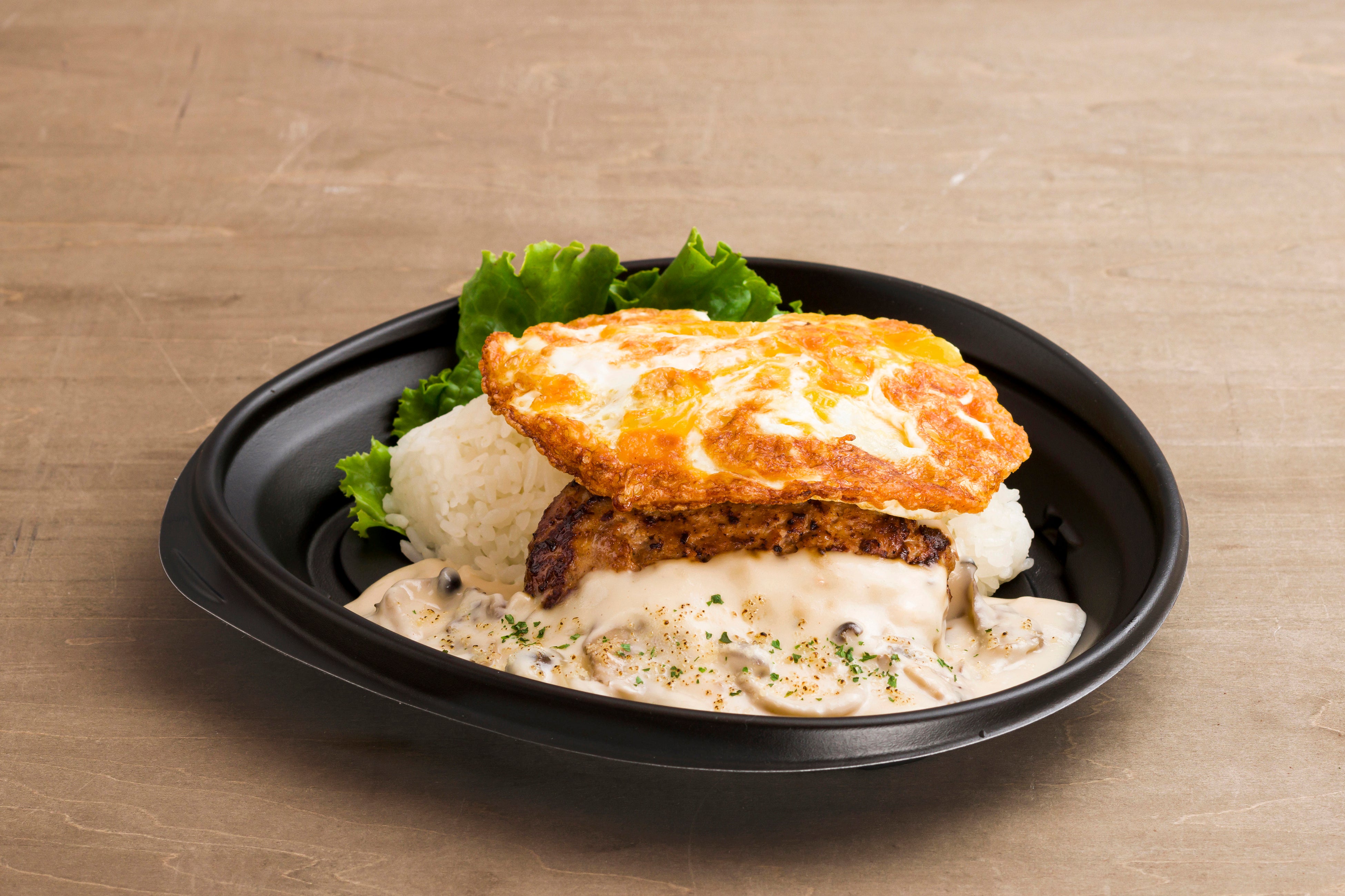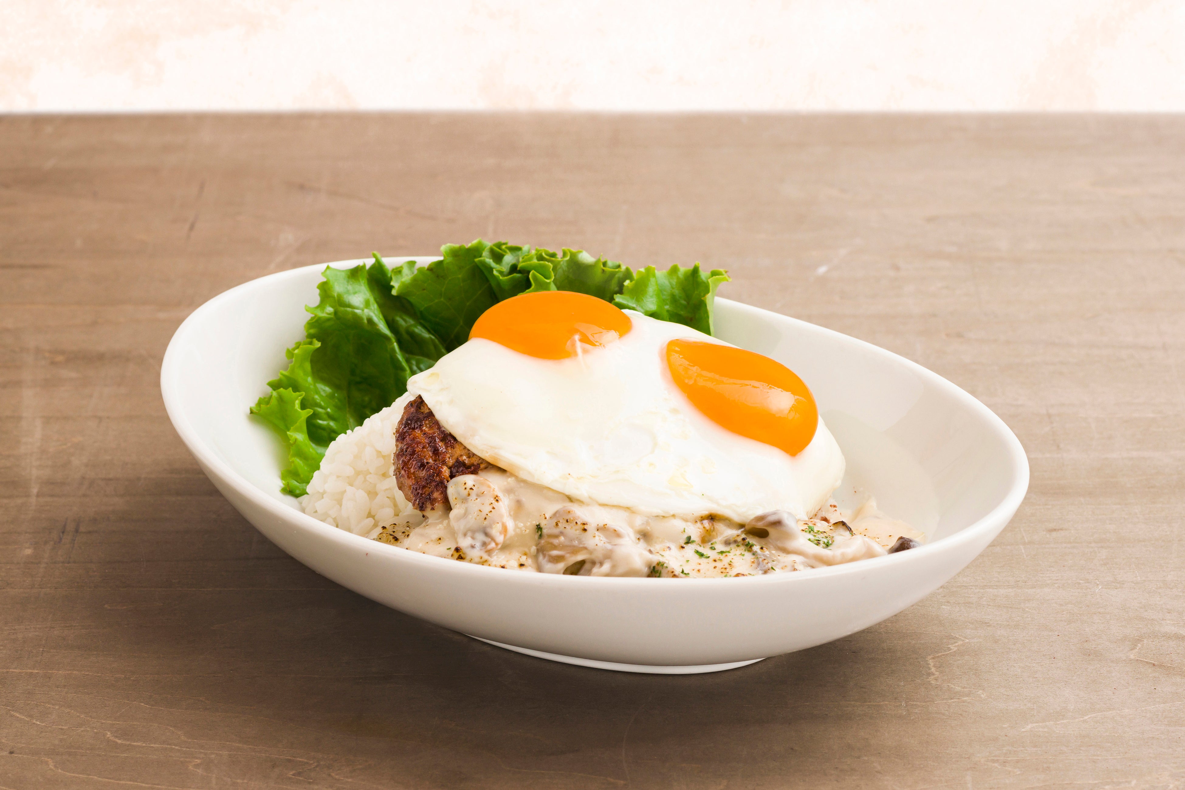 100%ビーフパティをのせたハワイのロコフード「ロコ・モコ」。3種のキノコを加えてじっくり煮込んだ濃厚なホワイトソースとパルメザンチーズをかけて香ばしく焼き上げました。