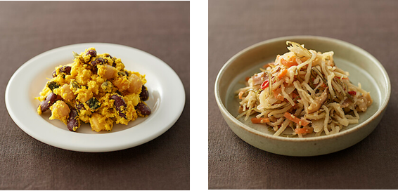 ひじきをベースに、小松菜や枝豆、焼きちくわなど9種類の素材を合わせた具だくさんの「彩り野菜とひじきの煮物」、七味唐辛子のピリッとした辛さと柚子皮のさわやかな香りが特長の「ごぼうと九条ねぎのきんぴら 柚子風味」、しいたけと昆布だしのやさしい味わいが楽しめる「小松菜と揚げの煮びたし」の3種類です。