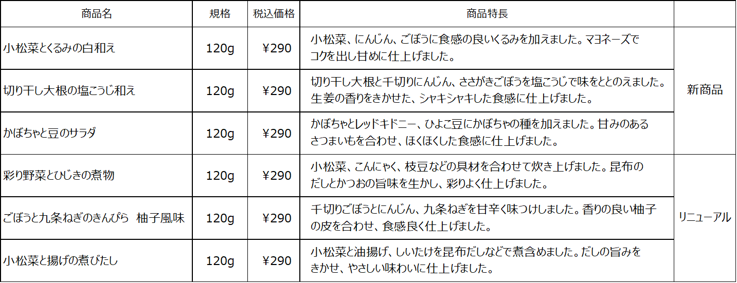お惣菜シリーズは、現在、肉や魚を使った餃子やハンバーグ、さばのローストなど15種類販売しています。今回は、食材の準備や下ごしらえに時間がかかる野菜の惣菜で、揚げたさつまいものコクや甘みを合わせた「かぼちゃと豆のサラダ」、酸味をきかせたさっぱりした味わいの「切り干し大根の塩こうじ和え」、しょうゆ、砂糖、昆布だしでやさしい味わいに仕上げ、マヨネーズでコクを出した「小松菜とくるみの白和え」の3種類を新たに追加します。