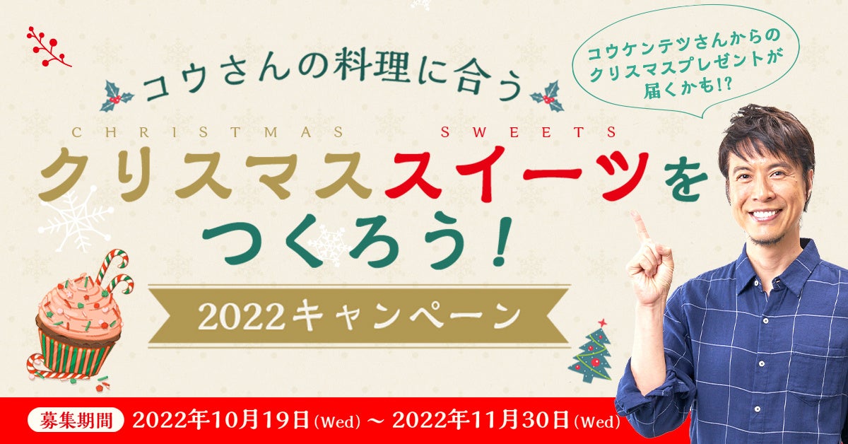 コウケンテツさんのYoutubeチャンネル掲載のレシピ「鶏手羽の照り煮」に合うオリジナルクリスマススイーツを、インスタグラムから募集します。レシピのテーマは「誰でも簡単に、そしておいしく」。コウケンテツさんの審査の結果、入賞された方にはプレゼントが届きます。使っていただく商品は「400gスタンドパックシリーズ」「サッと使える砂糖ボトル」「石垣島のおいしいお砂糖」「キヌア」です。