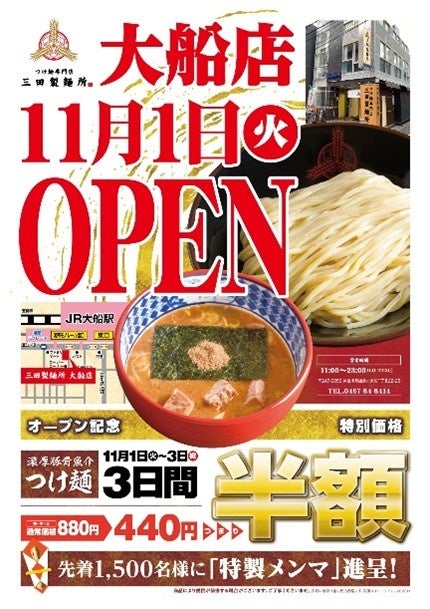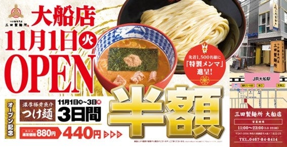 当店のOPENを記念して、11月1日(火)~3日(祝)の三日間「つけ麺半額セール」を開催致します。この期間中、三田製麺所の定番『濃厚豚骨魚介つけ麺』が通常880円(税込み)のところ、半額の440円(税込み)にてお召し上がり頂けます。近隣にお住まい・お勤めの方には、この機会に是非一度お越し頂ければ幸いです。
