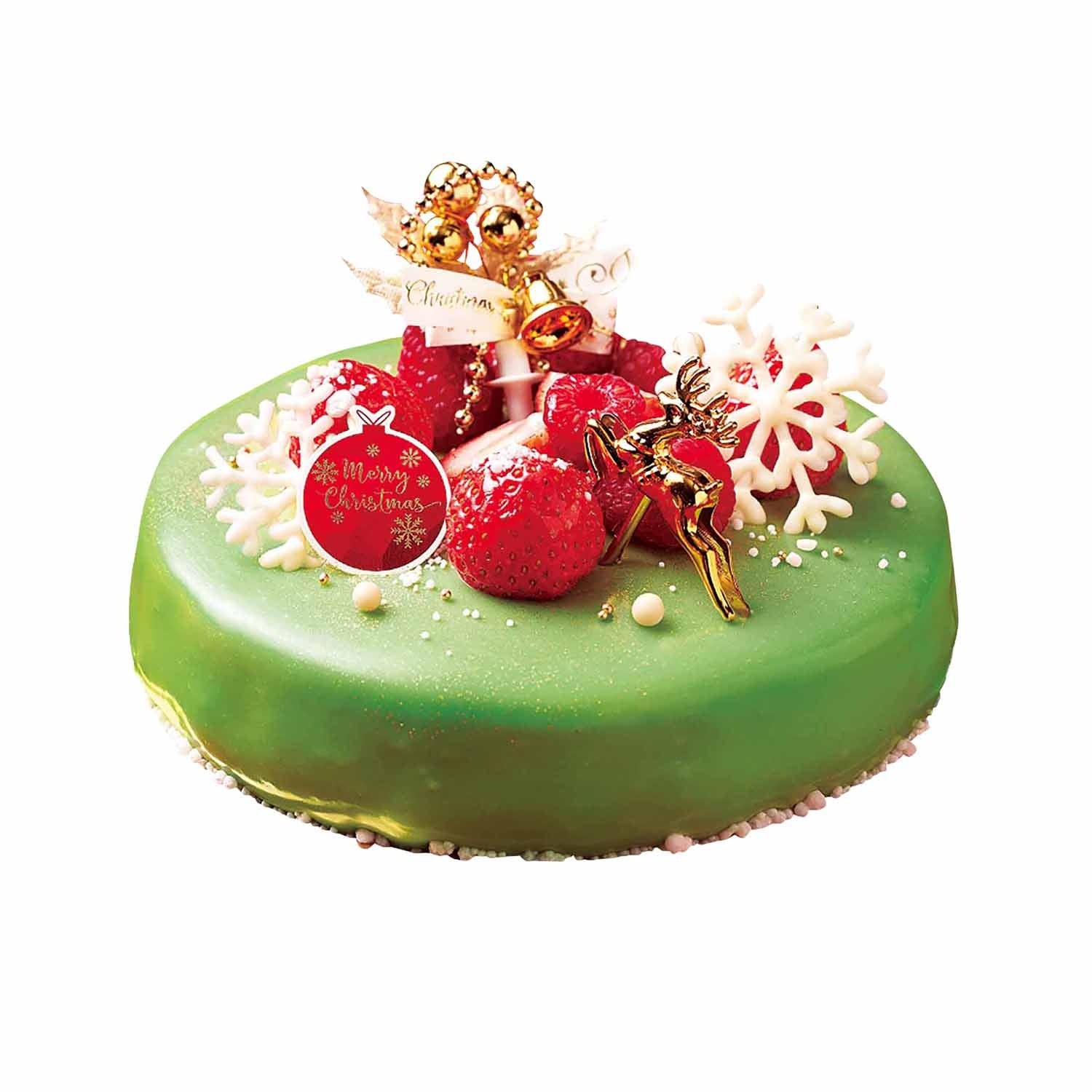 苺をサンドしたふんわりショートケーキに、ピスタチオのグラサージュをとろりとかけました。
