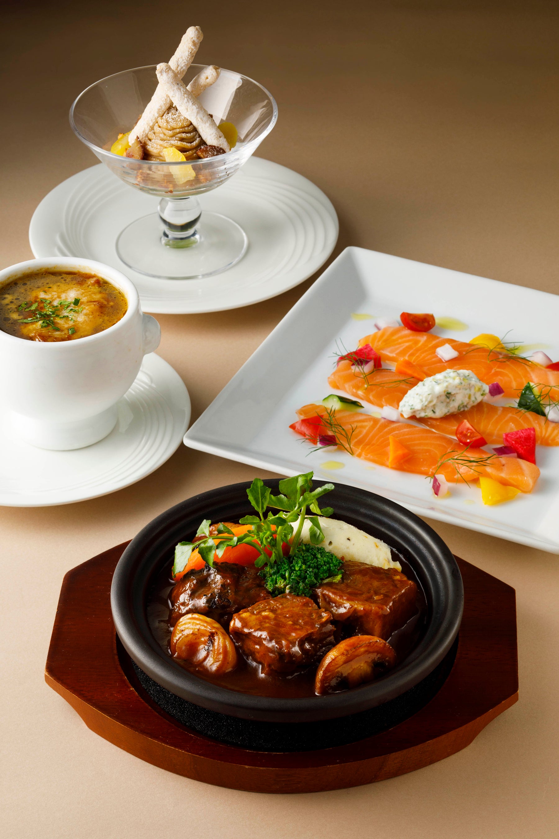1985年に東京・四ツ谷のフランス料理「オテル・ドゥミクニ」をオープンして37年。フランス料理界の巨匠として”世界のミクニ”と呼ばれているほか、2021年「文藝春秋 創刊100周年 昭和・平成・令和を彩る」日本の顔ベストセレクション14人の一人に選ばれるなど、地産地消の礎を築かれてきた三國シェフがホテルの洋食レストランである、カステリアンルームを1か月間プロデュース。うま味出汁香る”オニオングラタンスープ”や”黒毛和牛のビーフシチュー”など、王道の洋食メニューを三國シェフ流の進化した形でお届けします。