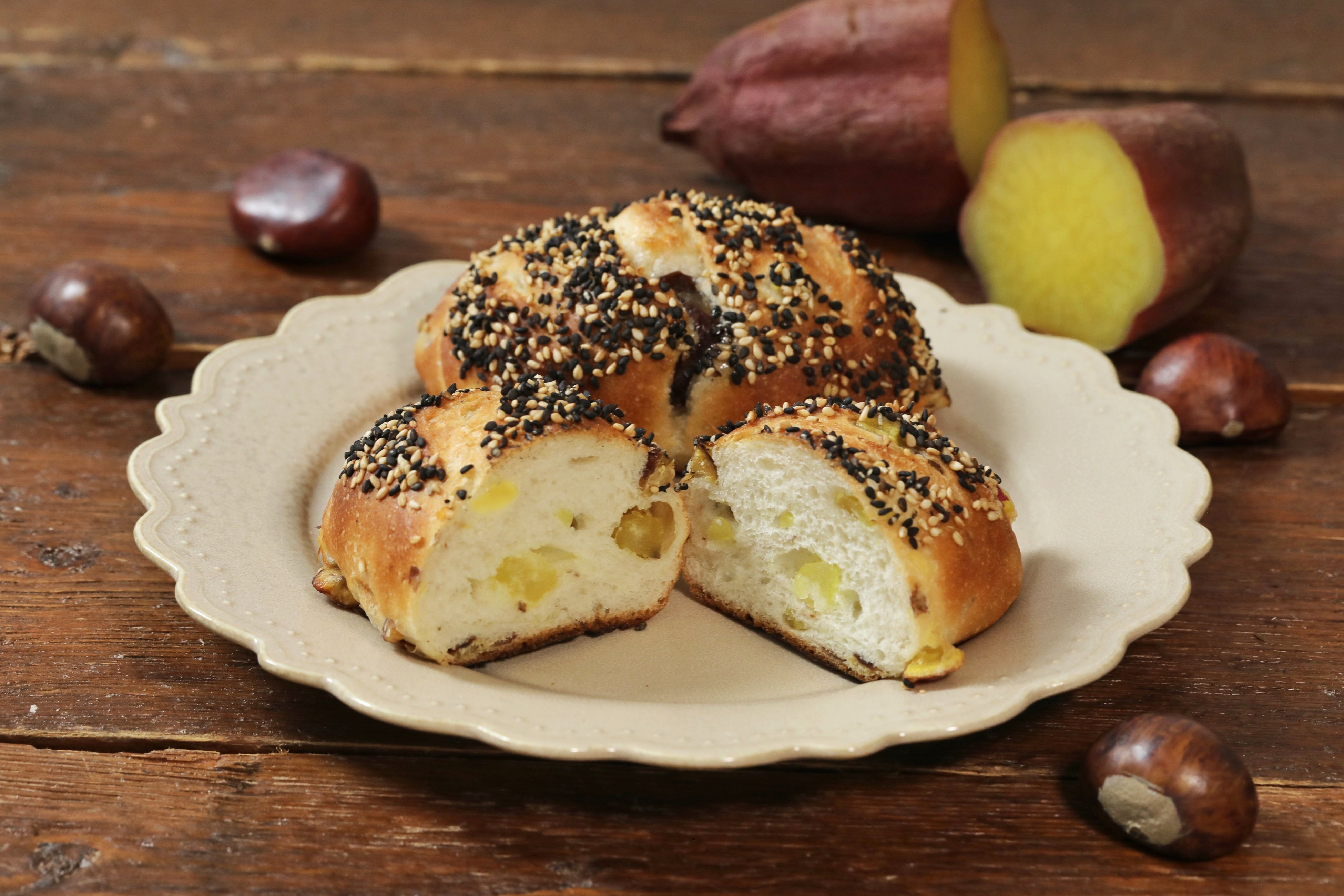 渋皮栗となると金時のほっくりとした甘味やしっとりとした生地の食感をお楽しみいただけます。トッピングには白黒2種類の胡麻を使用することで、より胡麻の香ばしい風味が引き立つよう仕上げました。