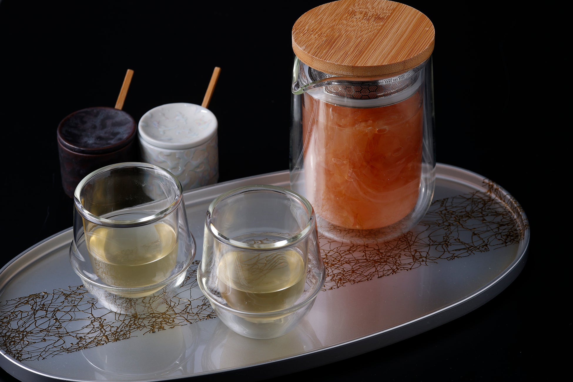 ウェルカムドリンクは現在ご好評の「引き立て一番出汁」です。寝かしてうま味を増した「蔵囲い昆布」と「枯節」をたっぷりと使用し、凝縮したうま味と塩気で、甘みへと誘います。時間と共に変化する昆布と鰹節の風味を、スイーツの合間にお楽しみください。