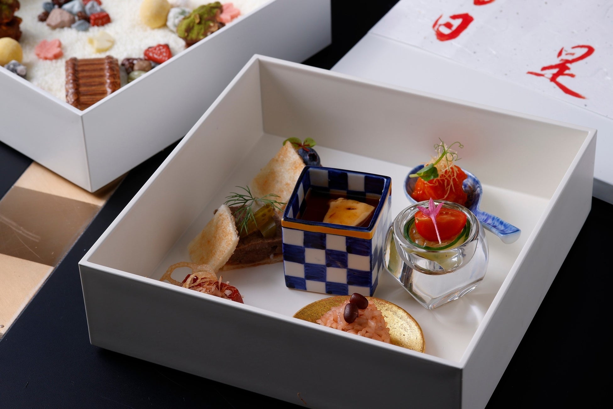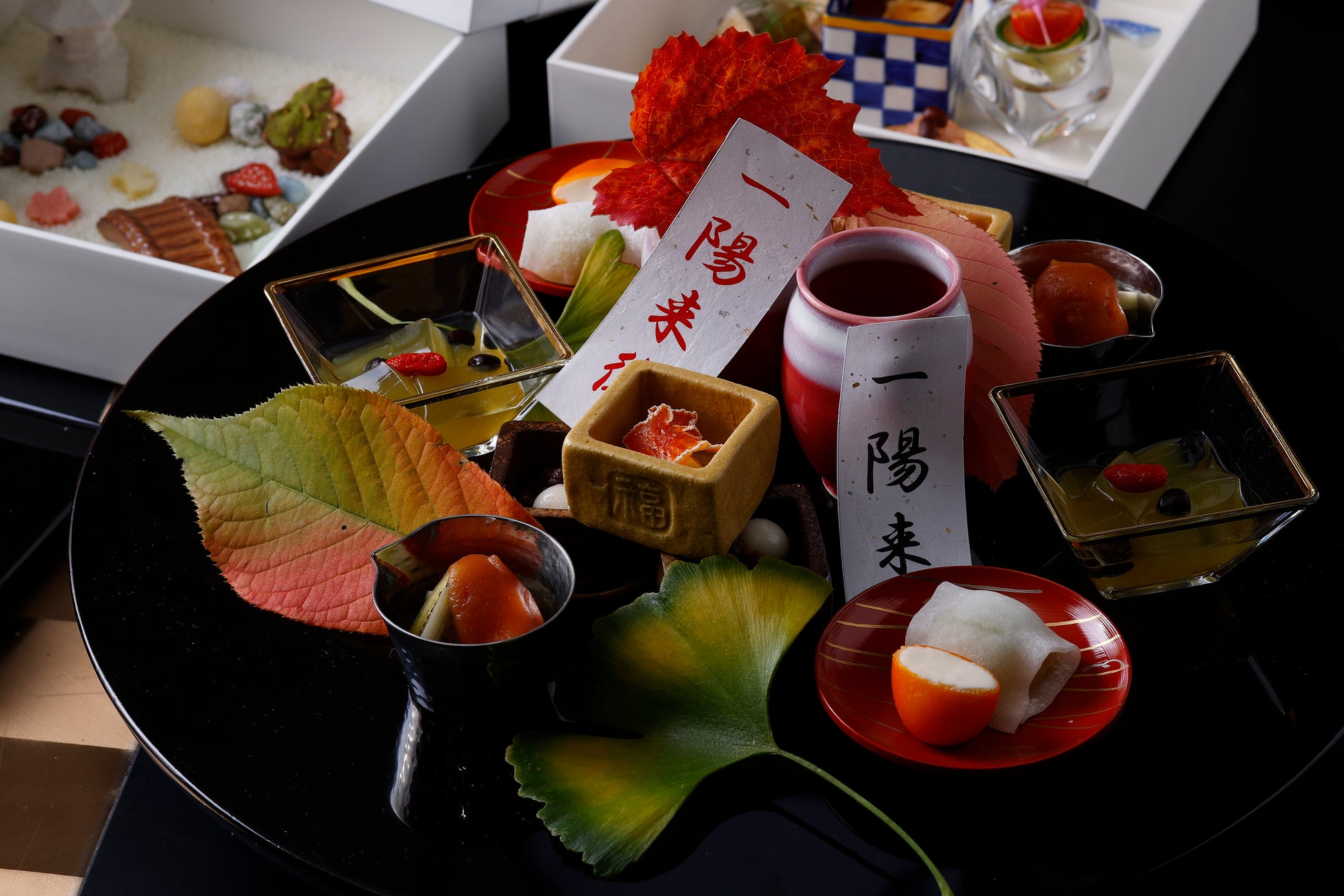 神奈川産の恵壽卵を使用したプリンなどがそろう「島台」は、「一陽来復」という言葉と共に、召し上がった皆様に幸運が訪れるようにと、料理長 青木が願いを込めご用意いたします。