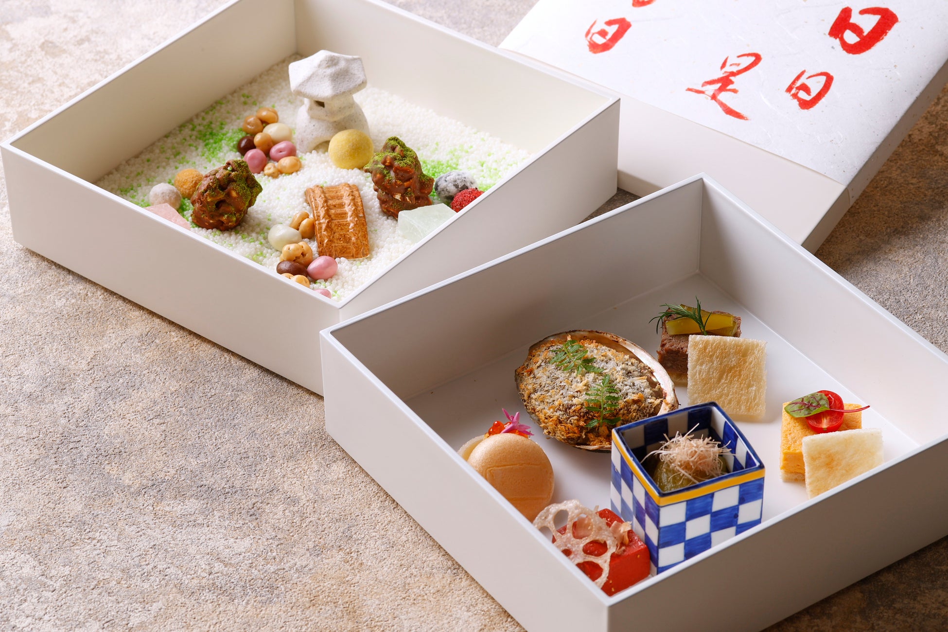 国の名勝に指定された横浜の日本庭園「三渓園」をイメージした箱庭の重。三渓園公認の「濱手箱」は、チョコブロックに抹茶の粉をふり、苔むした岩に見立てています。料理長自家製の薄水色の琥珀糖は、軽くミントで香りづけ、三渓園の水辺を表現しております。季節を感じる干菓子を愛でながら三渓園の四季を感じていただけます。
