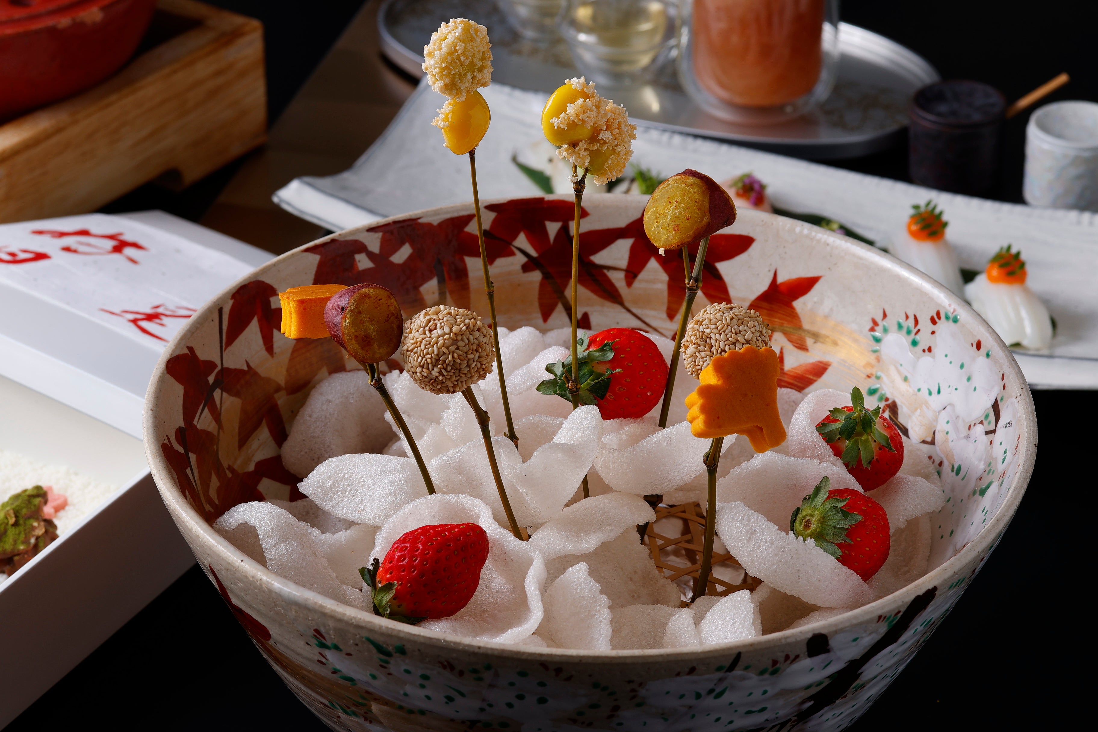 銀杏や野菜のカステラ、ほくほくのさつま芋、胡麻団子など。枝に咲いたようなかわい小菓子やお野菜をピックアップして、白雪餡にディップしながらお召し上がりください。白雪餡は、白みそと、白胡麻、吉野葛で仕上げた、胡麻の風味がたまらないソースです。産地が異なるイチゴの食べ比べもでき、揚げ煎餅もパリパリとお召し上がりになれます。