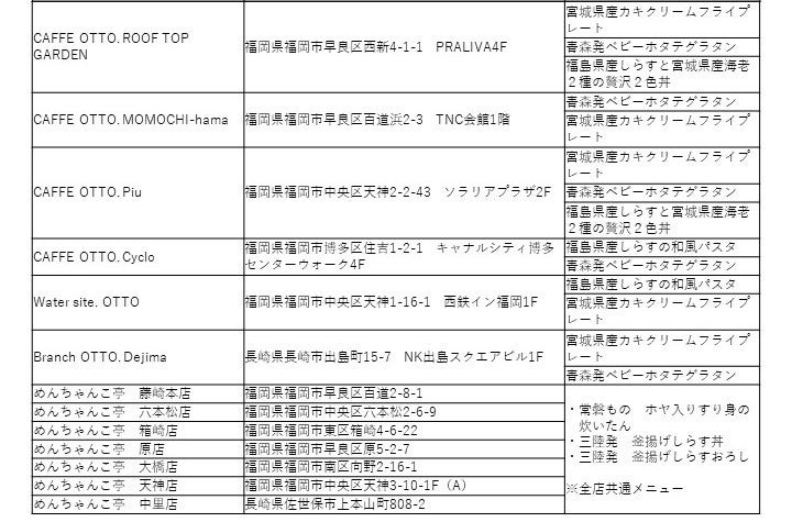 - 「三陸・常磐 うみうまフェア」第一弾 提供飲食店・メニュー一覧(福岡・九州エリア)