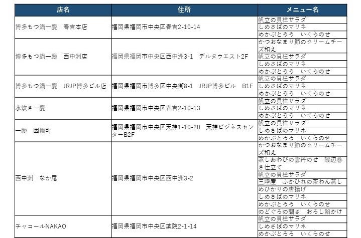 - 「三陸・常磐 うみうまフェア」第一弾 提供飲食店・メニュー一覧(福岡・九州エリア)