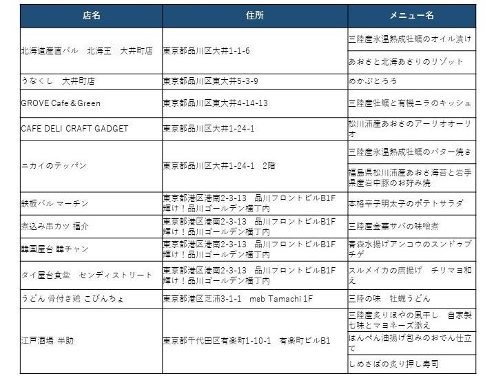 - 「三陸・常磐 うみうまフェア」第一弾 提供飲食店・メニュー一覧(東京・首都圏エリア)