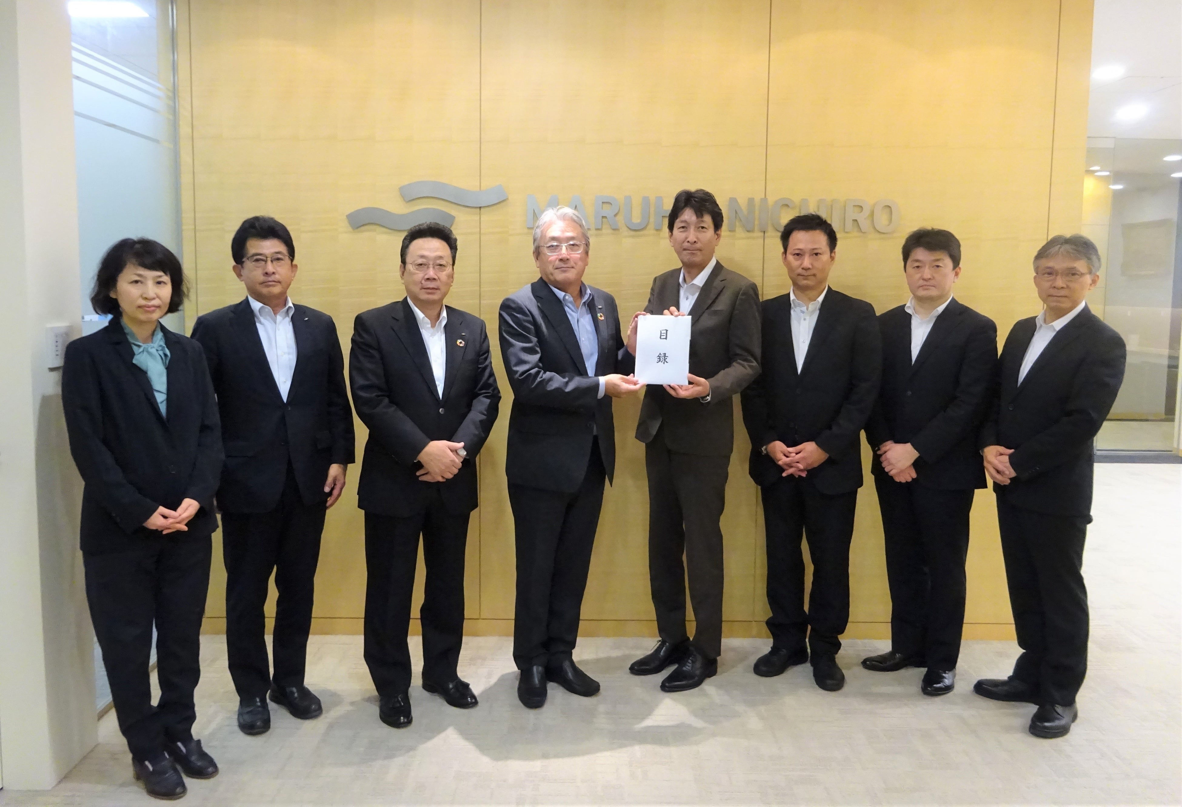 マルハニチロ㈱ 生協・無店舗営業部部長 小島直様、常務執行役員 安田大助様、取締役専務執行役員 半澤貞彦様、代表取締役社長 池見賢様、