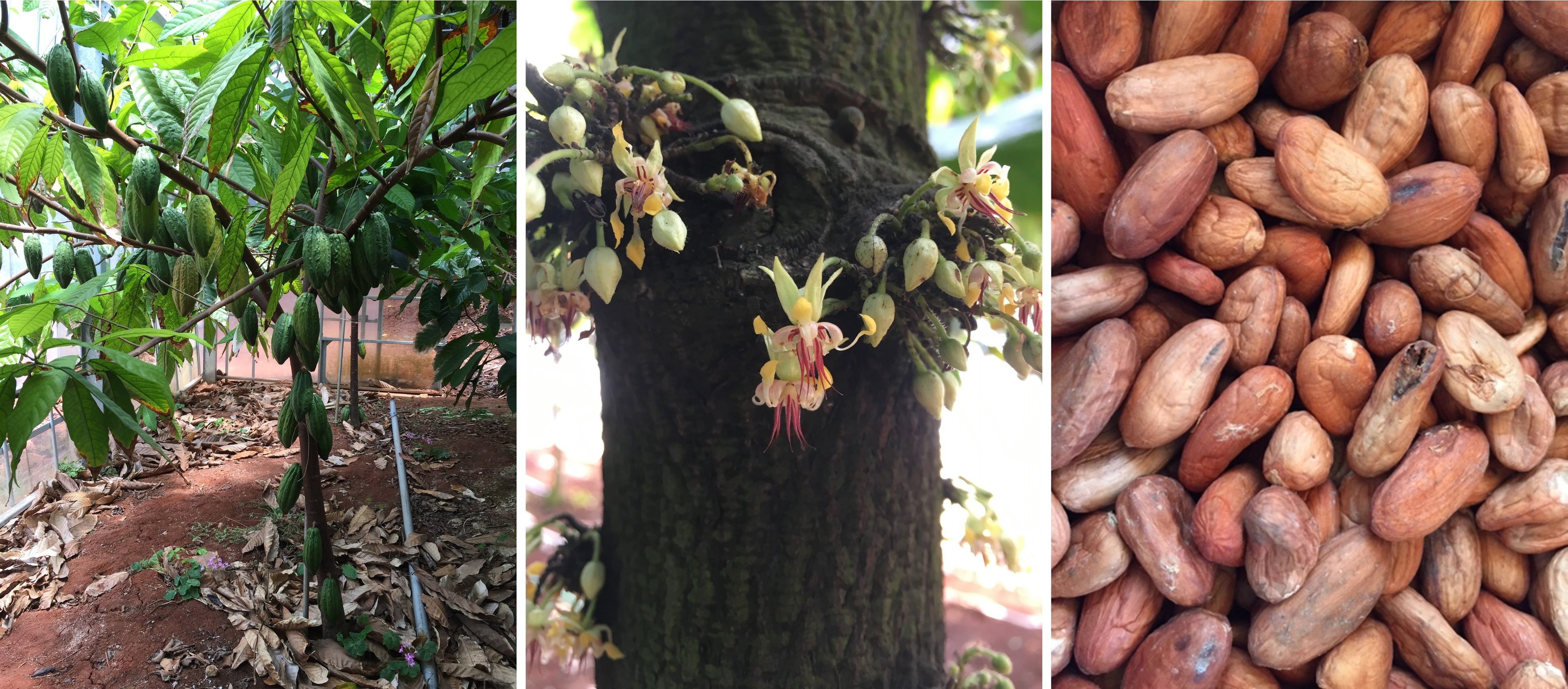 画像(左より):カカオツリー、カカオの花、カカオ豆
