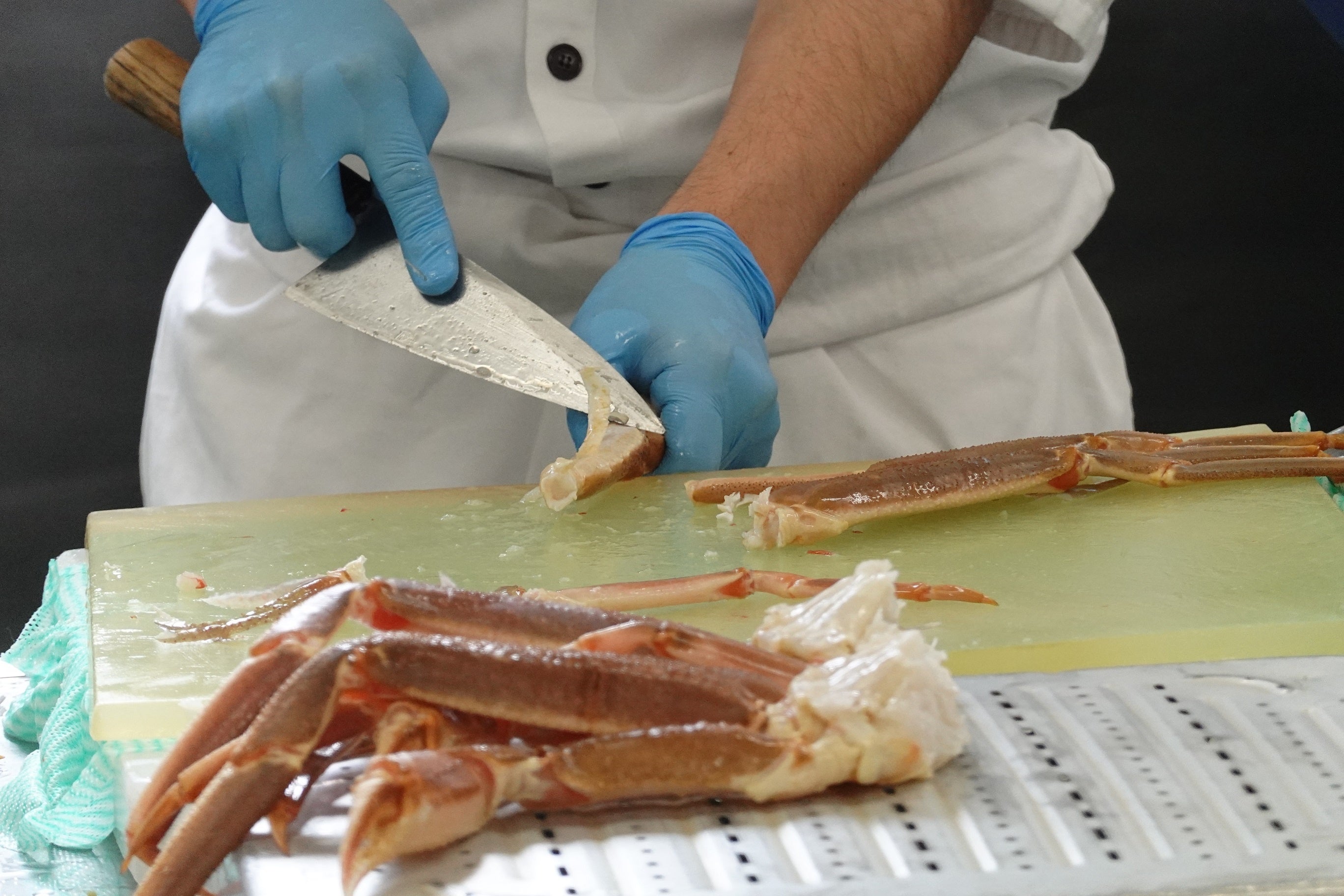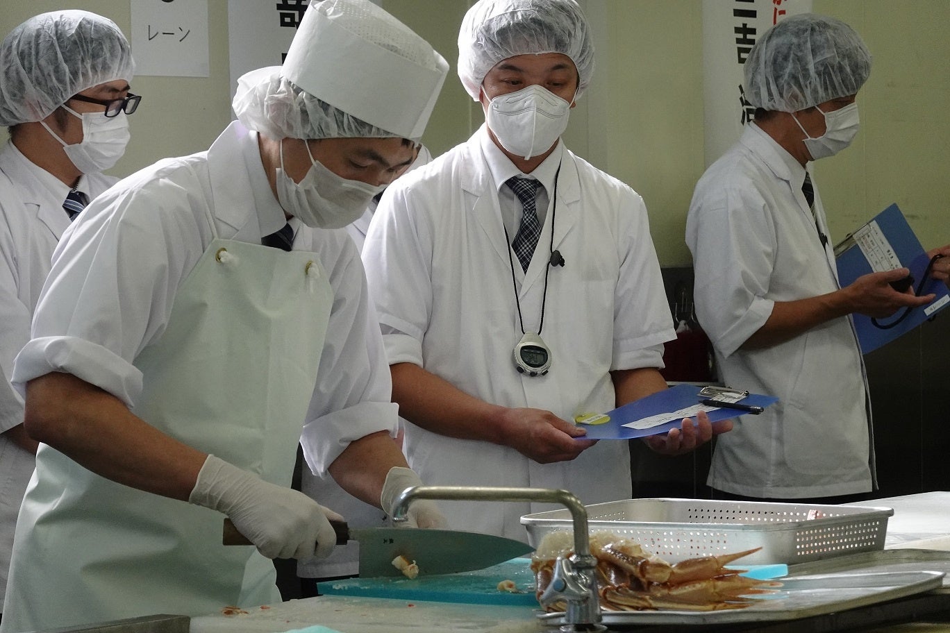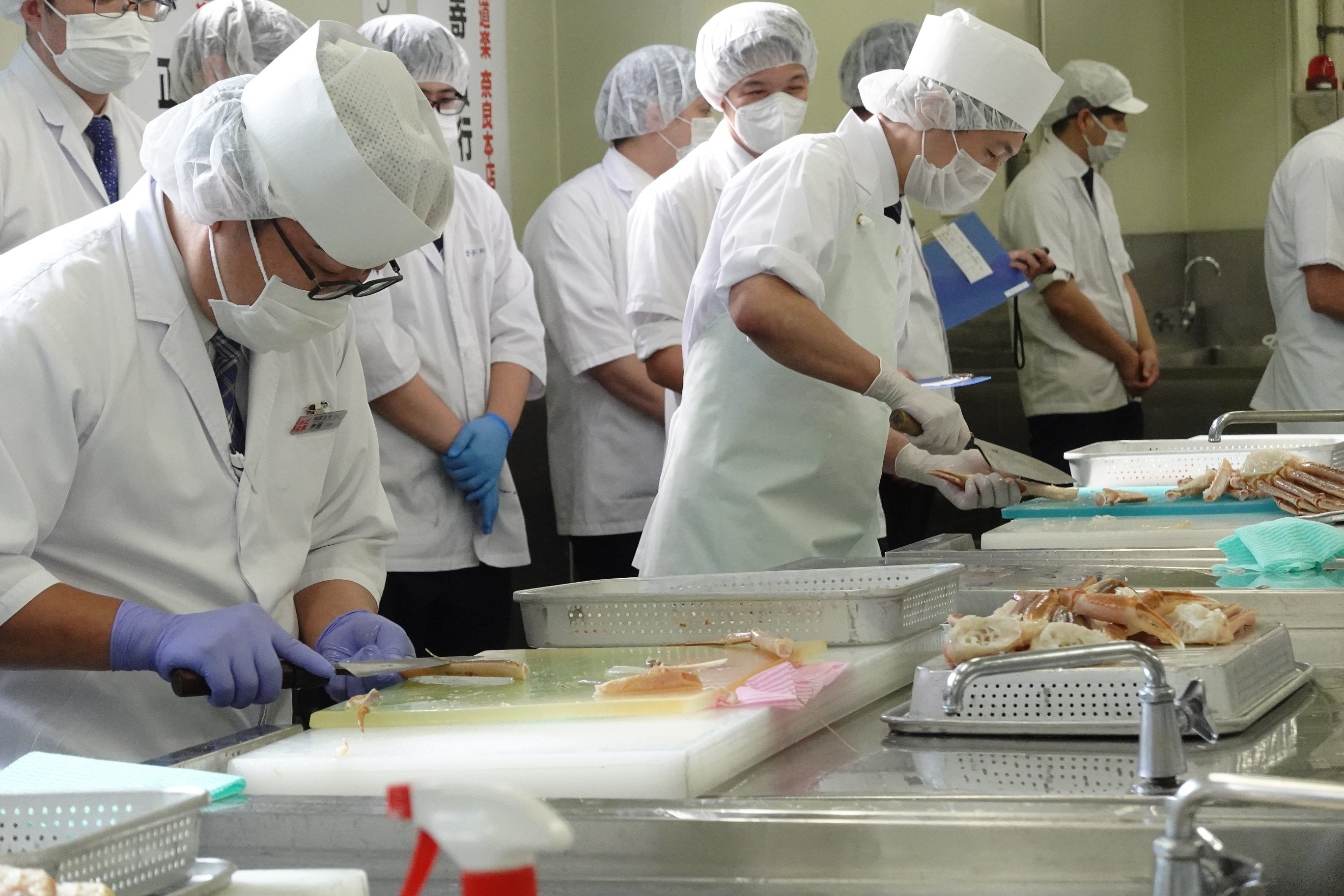 【大会の様子】各店の調理部員、応援者、幹部を含め、多くの方々に日々の仕事を披露する。会場は200名近くになり、緊張感が漂う。その中で、いかに日々の「かに切り」が出来るかが最大のポイント。上位10名の決勝進出者は流石の手さばき。1肩を約40秒ほどで切り上げる。何連覇するチャンピオンも過去には存在するが、本年度の藤嵜(ふじさき)主任は初タイトル。世代交代も行われており本年度は5年目の社員が決勝進出し、若手社員にも充分チャンスがある事を証明してくれました。