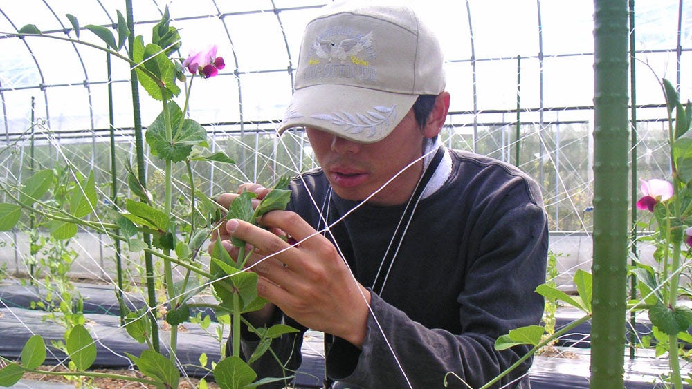 村上農園は、自社で品種改良にも取り組んでいます。様々な特徴を持つえんどう豆の品種同士を交配し、さらにおいしいオリジナルの品種を生み出しています。