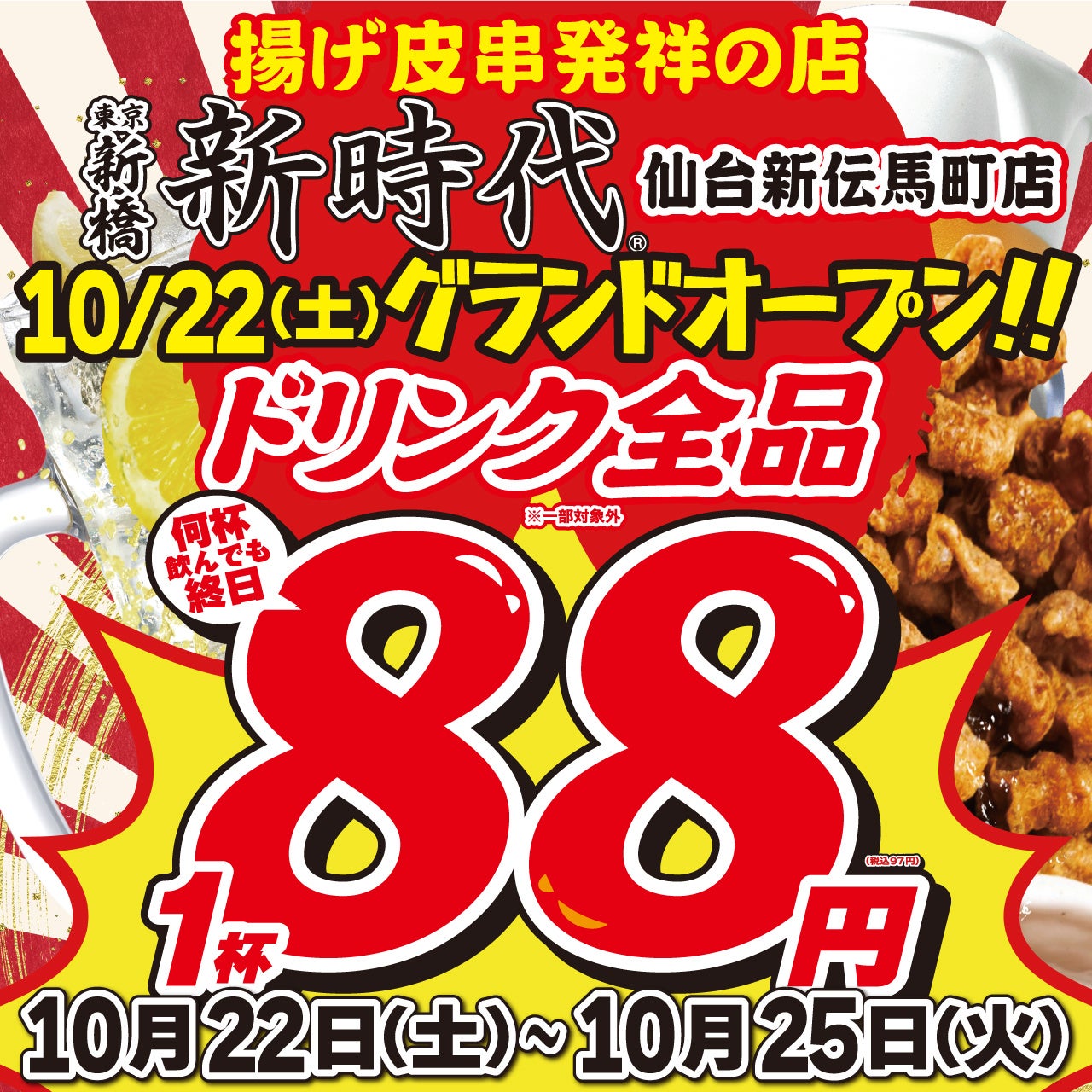 「新時代 仙台新伝馬町店」のオープンを記念し、ドリンク全品を1杯88円(税込97円)でお楽しみ頂けるキャンペーンを開催します。