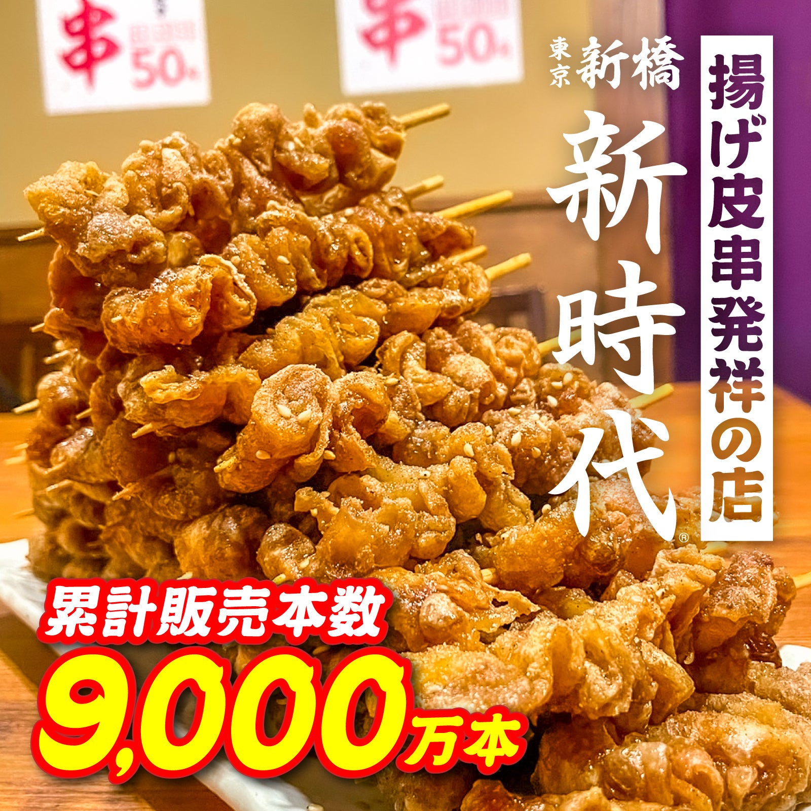 - 『新時代』の代名詞でもある名物の『伝串』は累計販売本数9,000万本突破と、大ヒット!
