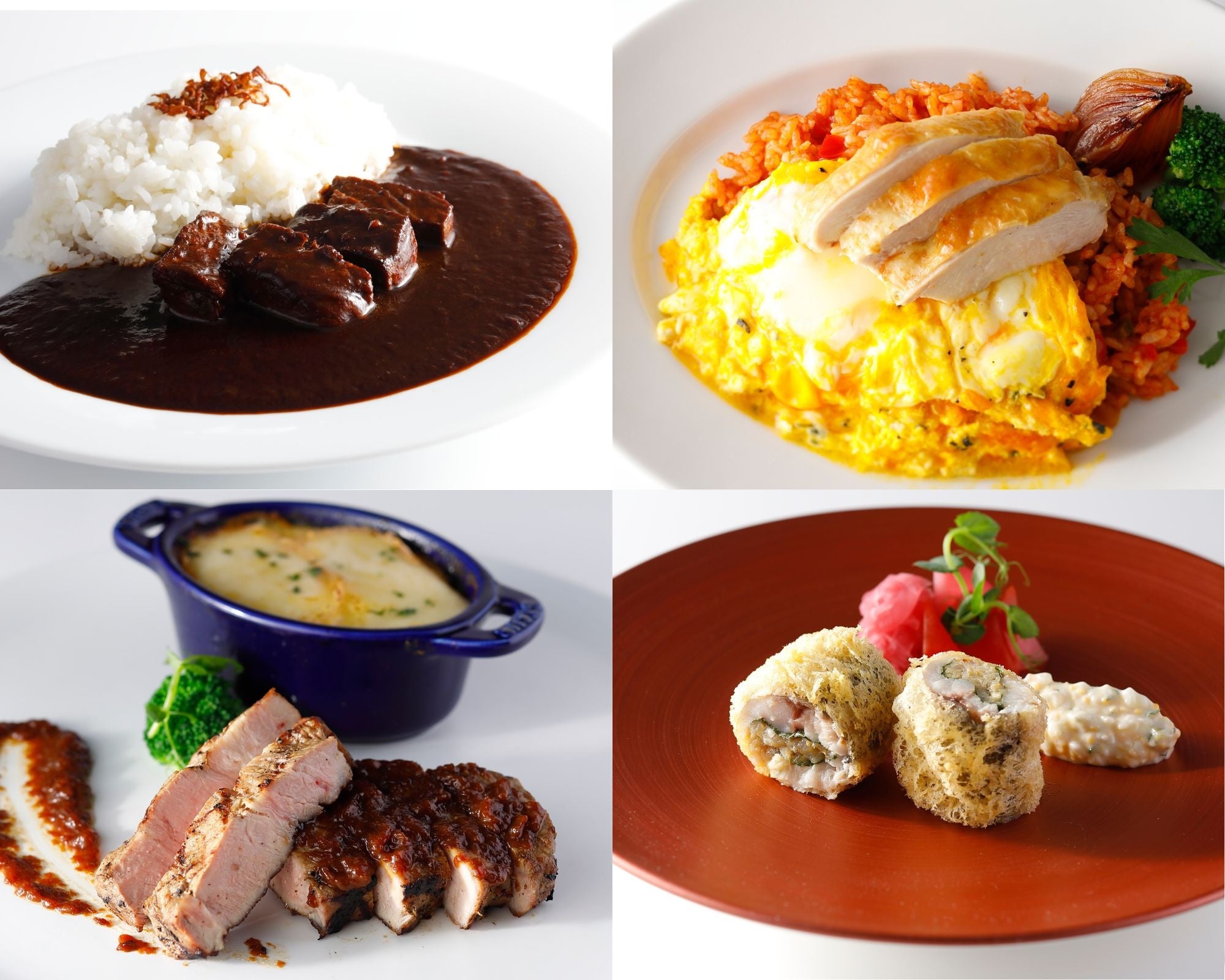 長崎県産「太陽卵」と丁寧に煮詰めたトマトの旨味を凝縮させて仕上げたふわとろのオムライスに、きめ細かい筋繊維と脂肪のバランスが良く、食感とともに旨みが感じられる福岡県産の銘柄鶏「はかた一番どり」のローストを添えた「はかた一番どりのローストチキンオムライス」。