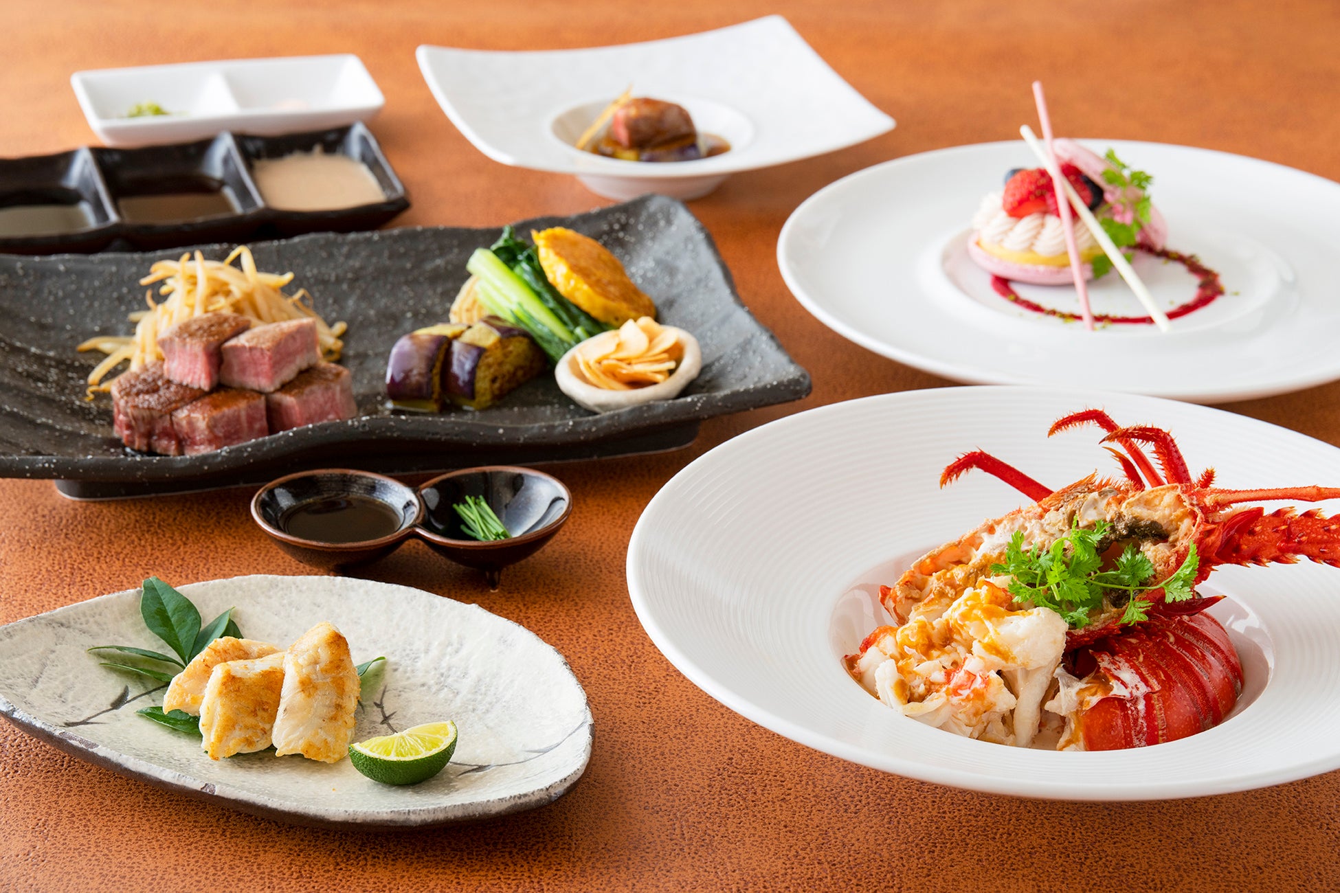 焼きふぐのすだち添え/フォワグラのソテ バルサミコソース/伊勢海老の鉄板焼 2種のソース/焼野菜/
