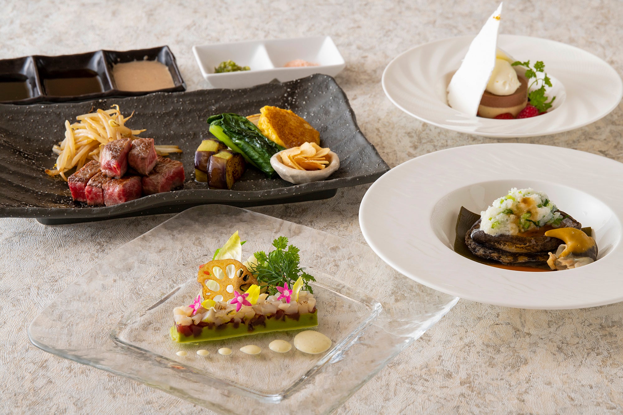 華やかなオードヴルに、新鮮な活鮑の鉄板焼、黒毛和牛ステーキが味わえる充実のコースです。