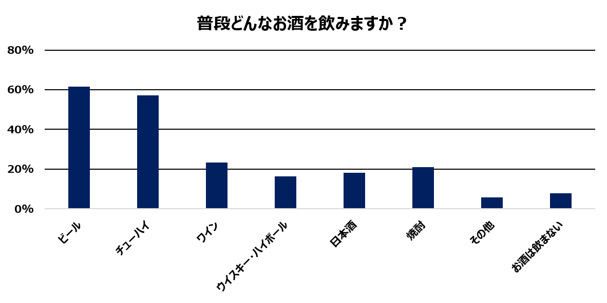 ビールと答えた方が一番多く62%。またチューハイと答えた方は57%となりました。ワイン、ウイスキー・ハイボール、日本酒、焼酎と答えた方はいずれも20%程度にとどまりました。