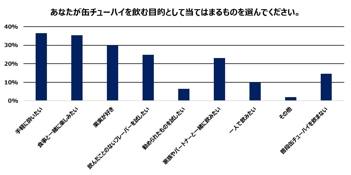 「手軽に酔いたい」と答えた方が最も多く36%、また35%の方が「食事と一緒に楽しみたい」と答えました。「果実が好き」と答えた方は30%でした。「飲んたことのないフレーバーを試したい」と答えた方の25%に対し、「勧められたものを試したい」と答えた方は6%にとどまりました。