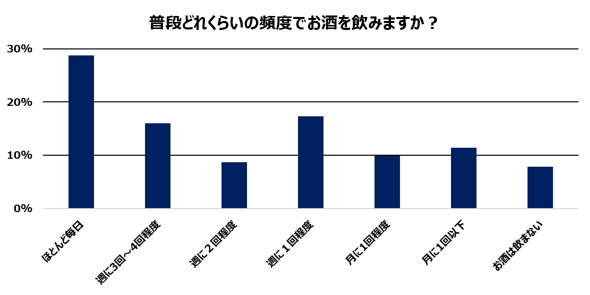 お酒の飲用頻度は、「ほとんど毎日」が最も多く29%でした。71%が週に1回以上飲むと答えた一方で、19%は全く飲まないあるいは月に1回以下と答えました。