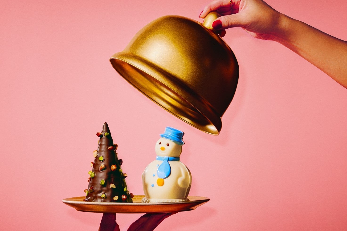 マシュマロ、チョコチップクッキー、オレンジピール入りのミルクチョコをワッフルコーンに詰め込み、ビターチョコでコーティング。ピスタチオとアーモンドで飾りつけた、クリスマスツリー型のチョコレート。
