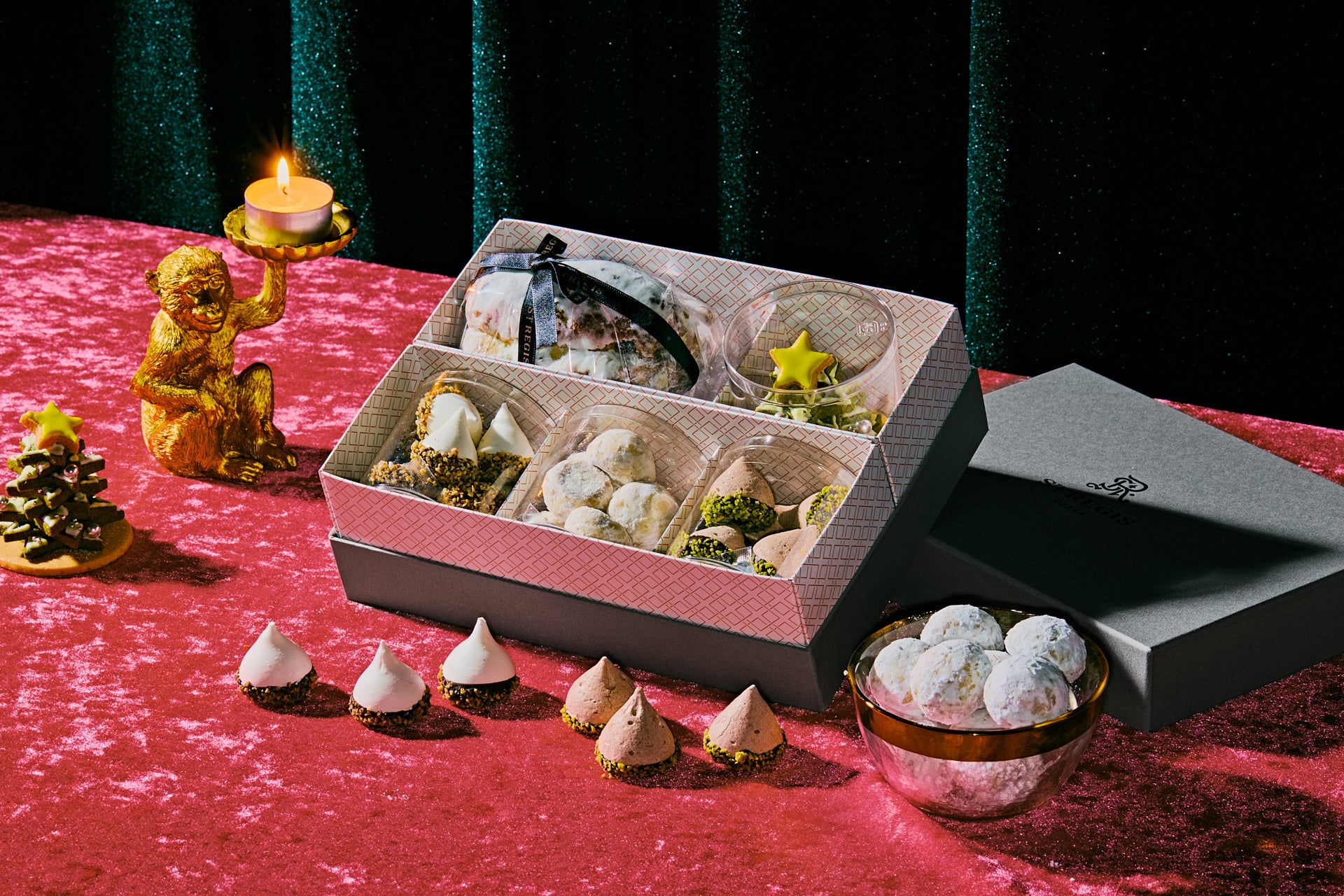 シュトーレン(S サイズ)、クリスマスクッキー、メレンゲアーモンド、メレンゲピスタチオ、ブールドネージュがセットになったギフトボックス。ご自宅用に、また大切な方への贈り物にもおすすめです。